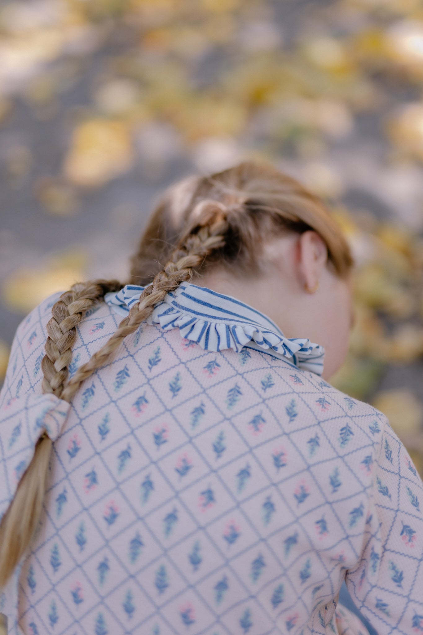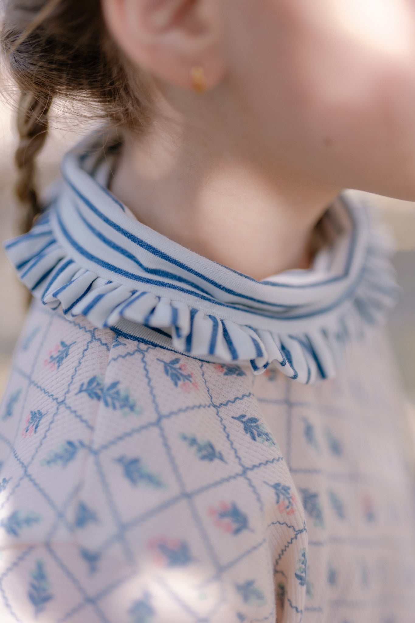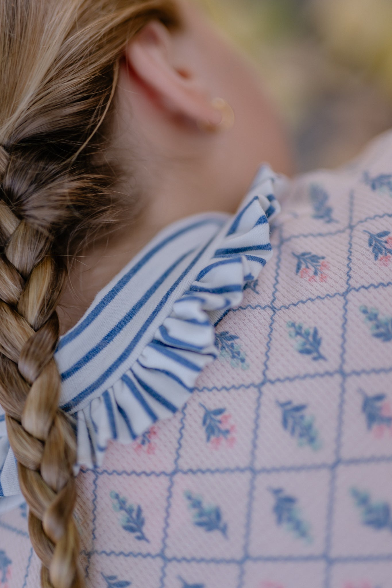 Beatle texturado rosa pálido estampado, con cuellito bajo de vuelito listado azul y blanco que no aprieta, cómodo y suave al usar. Perfecto para combinar con todo tipo de prendas y crear looks versátiles para cualquier ocasión.