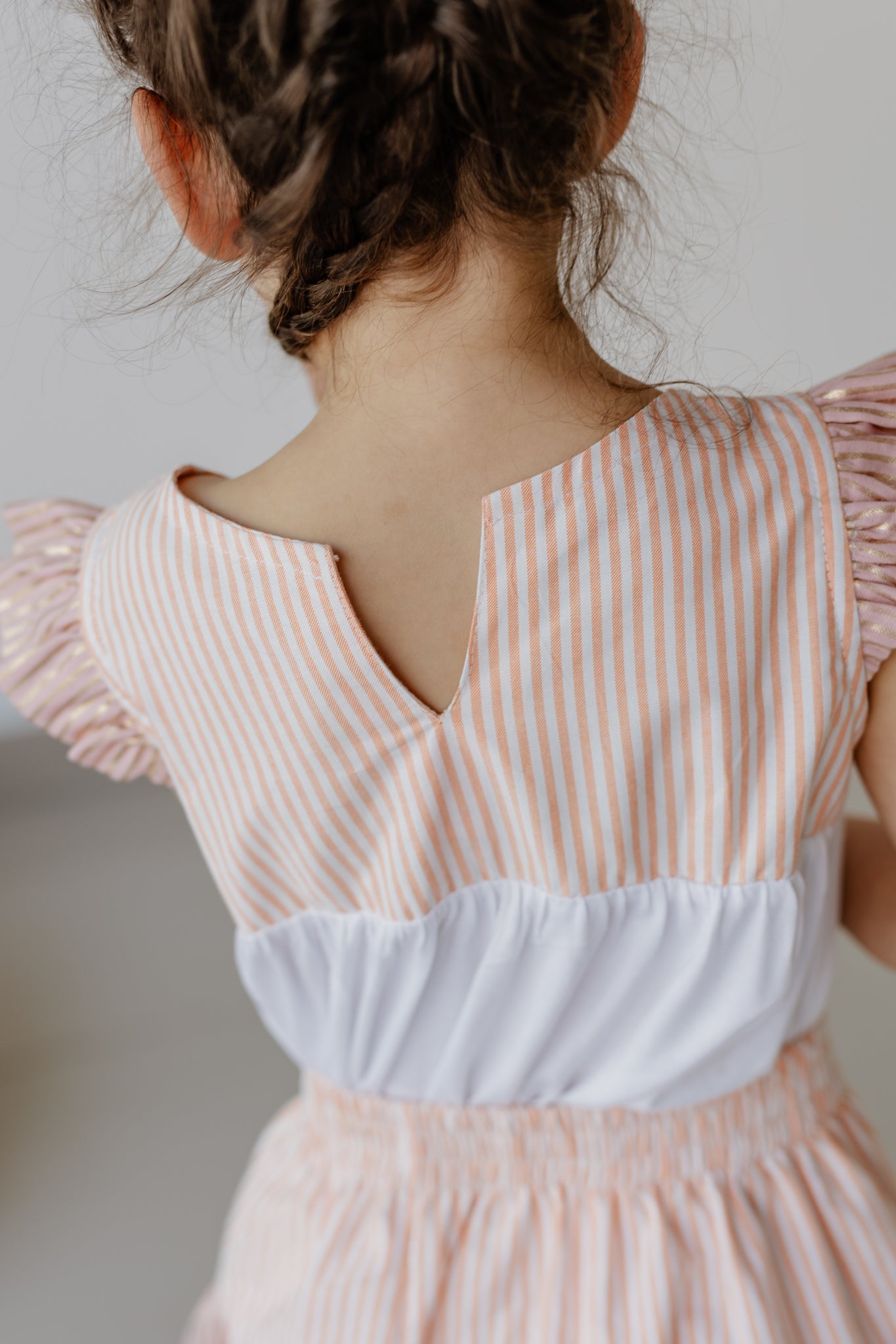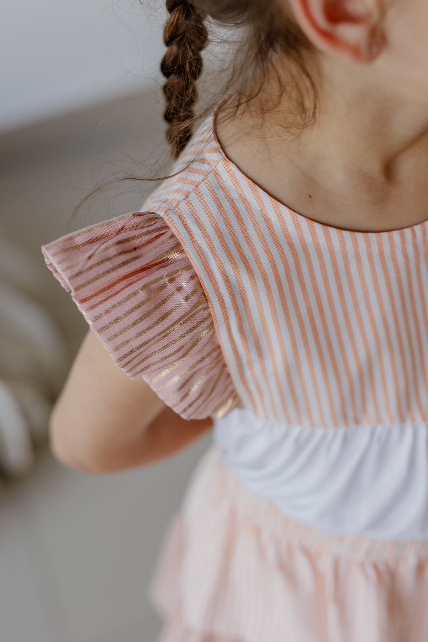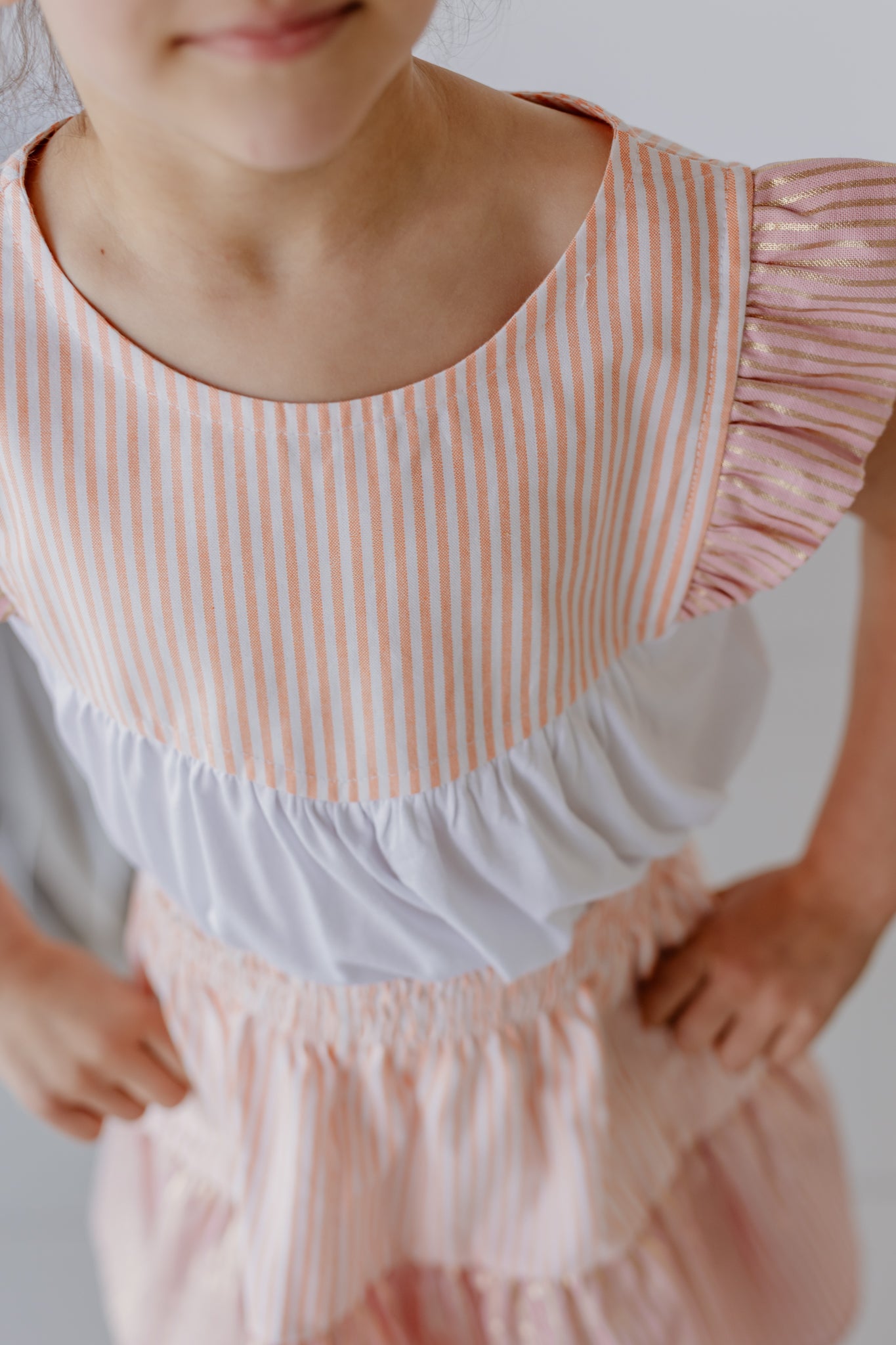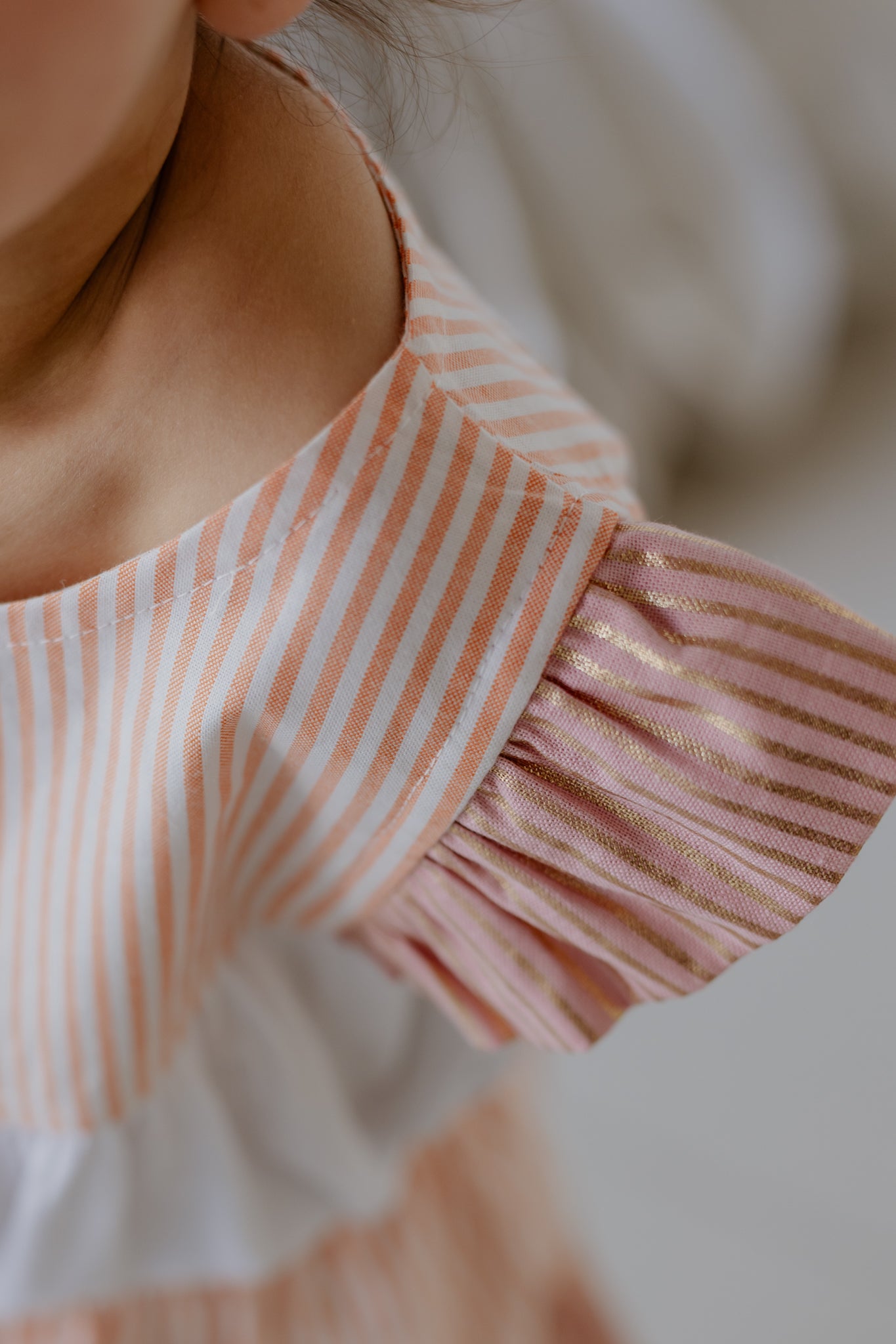 Esta polera está confeccionada en algodón blanco combinado con una tela de rayas en blanco, damasco, rosa y un sutil brillo dorado.