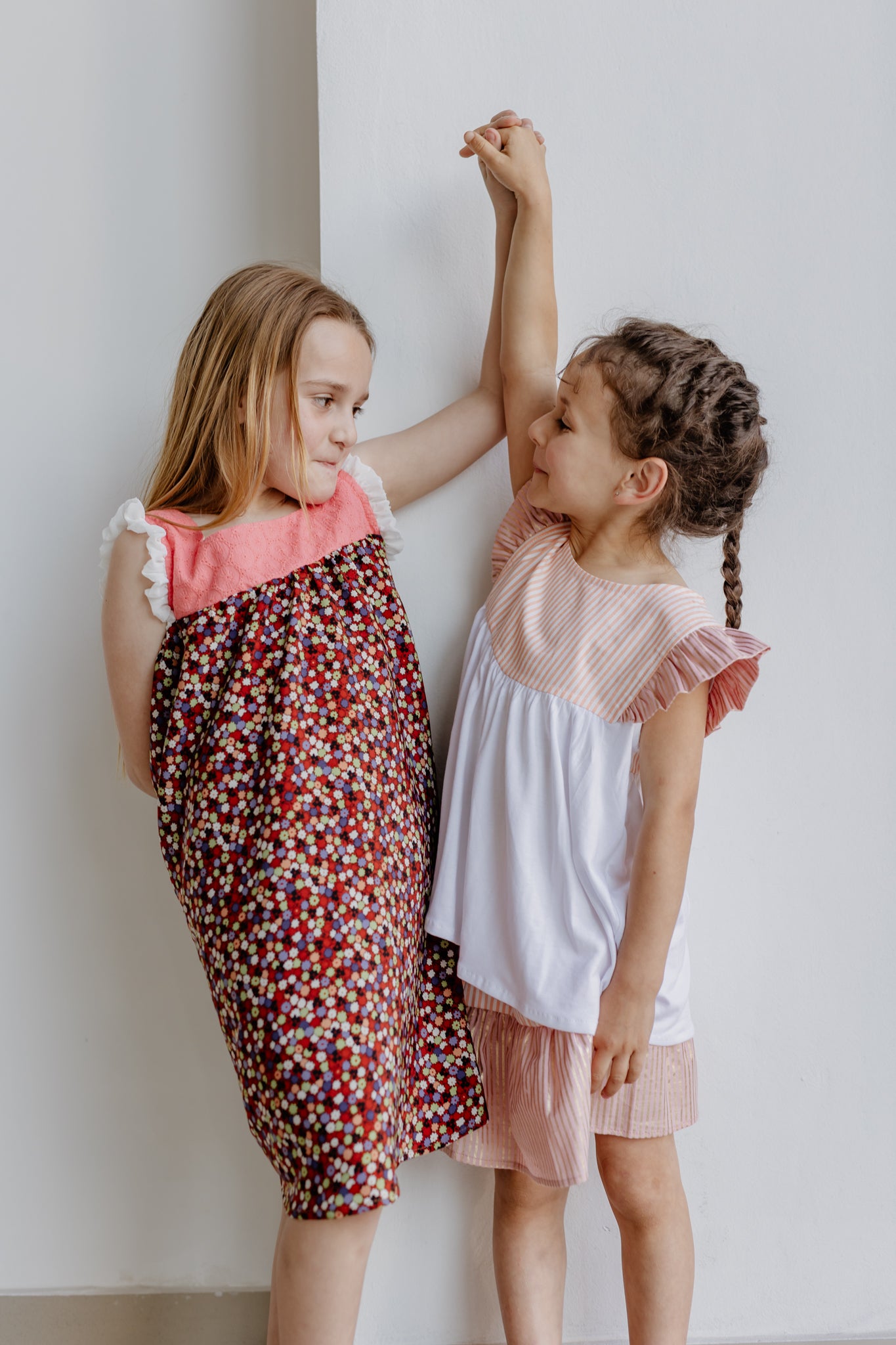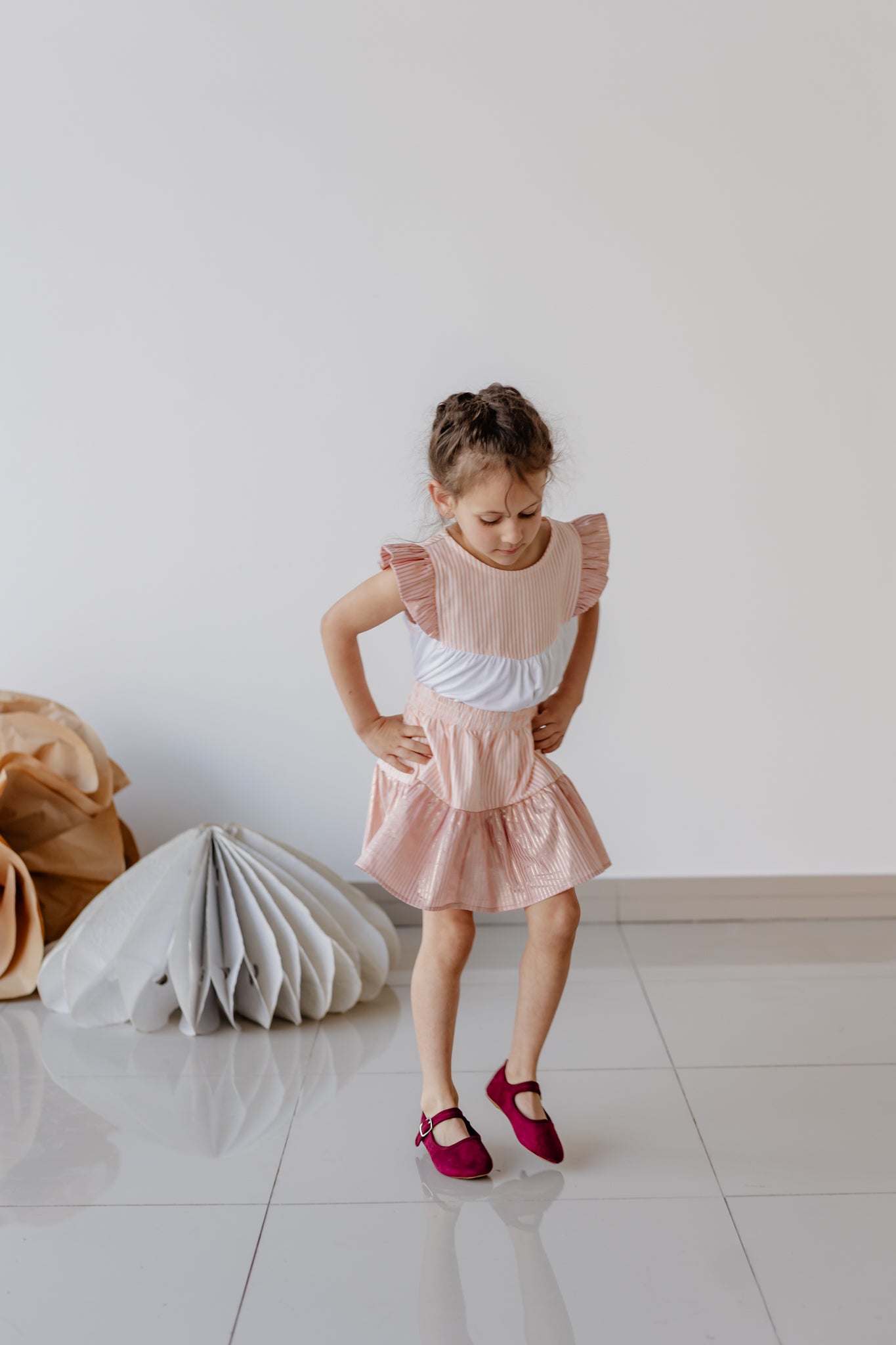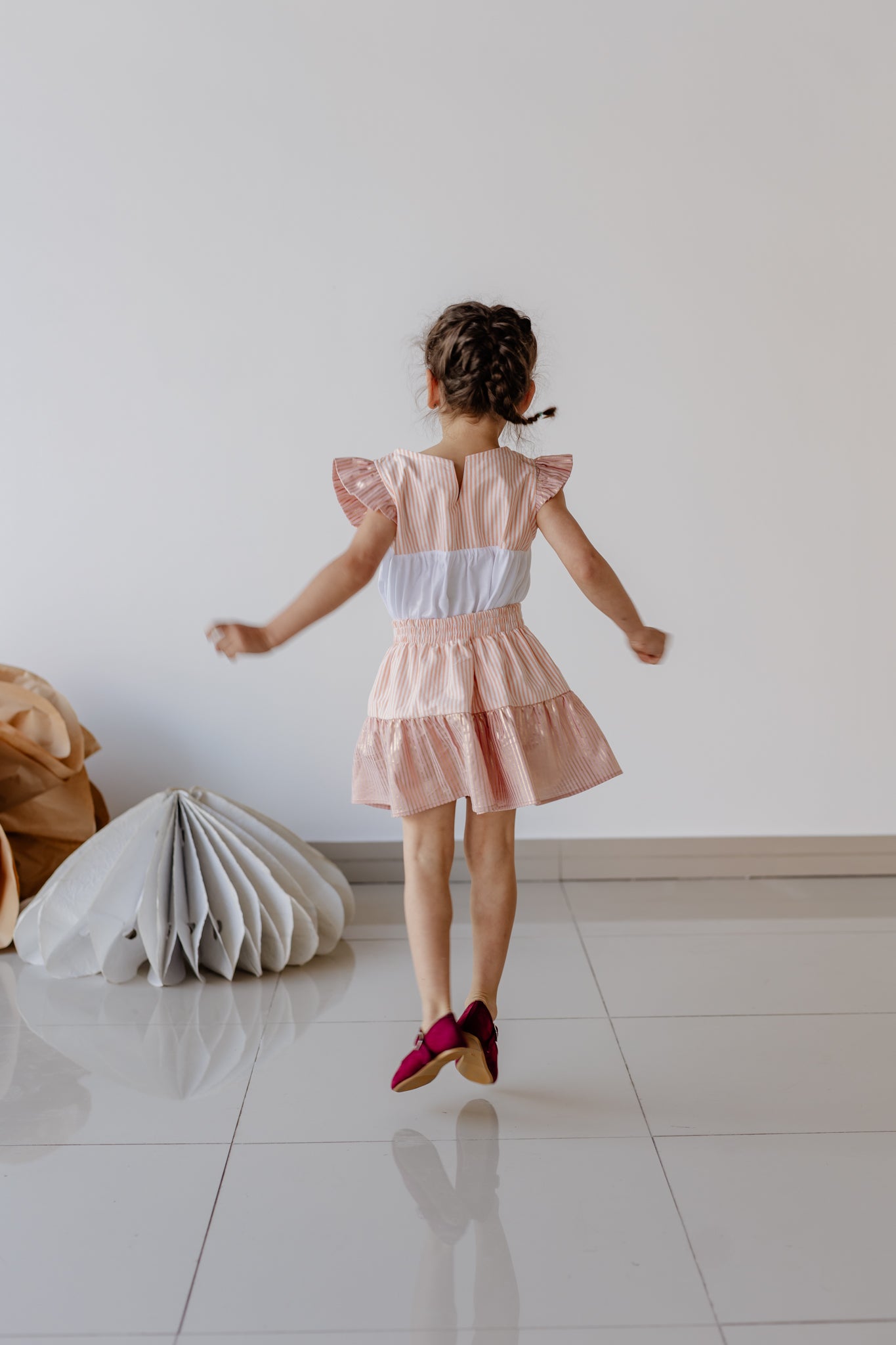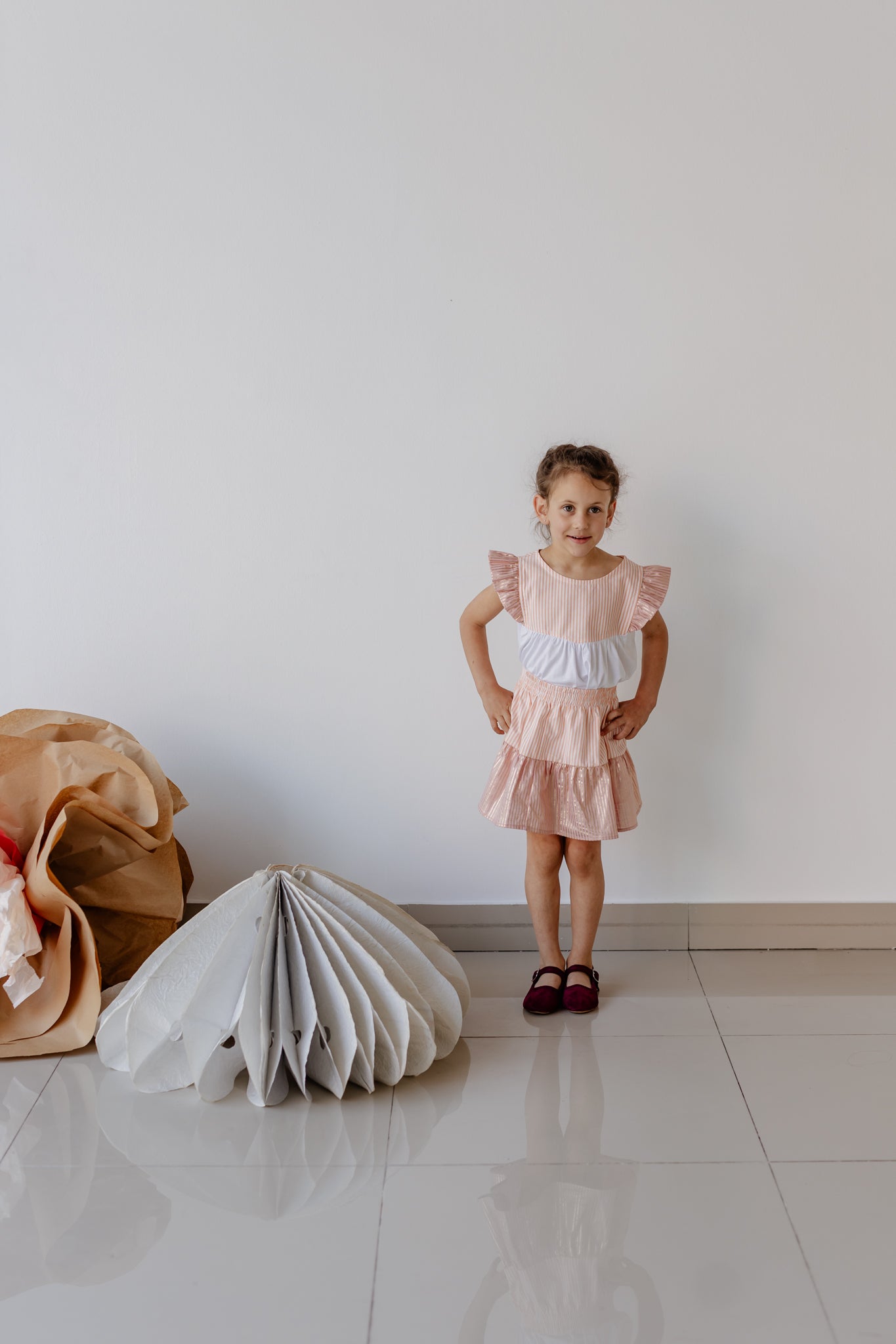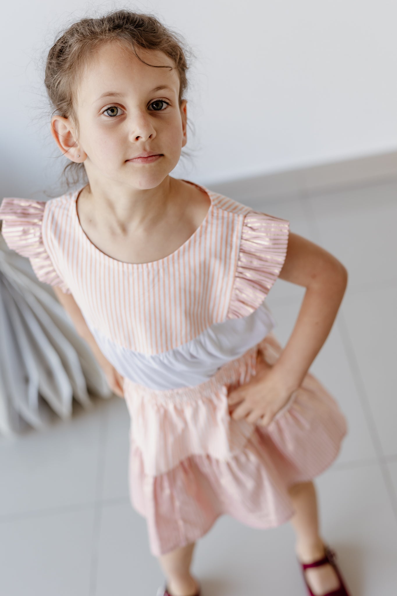 Esta polera está confeccionada en algodón blanco combinado con una tela de rayas en blanco, damasco, rosa y un sutil brillo dorado.