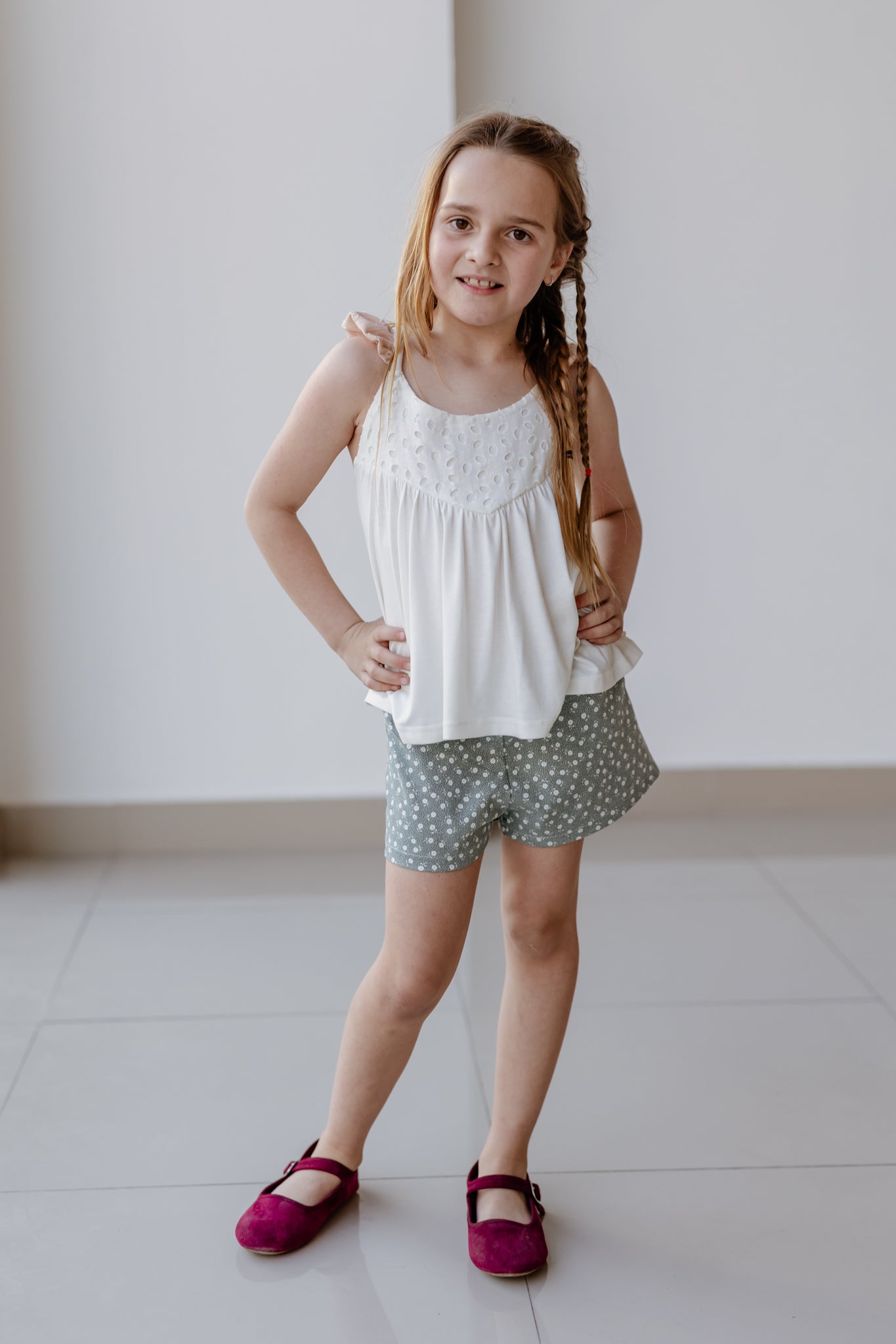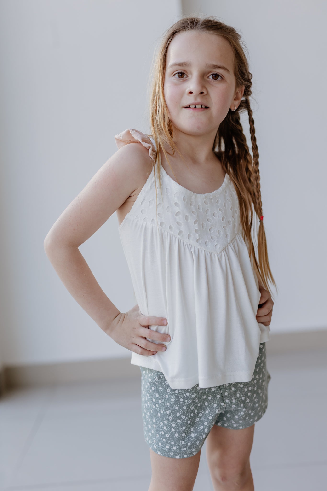 Polera blanca con canesú en broderie y tirantes con vuelitos rosa pálido texturados.