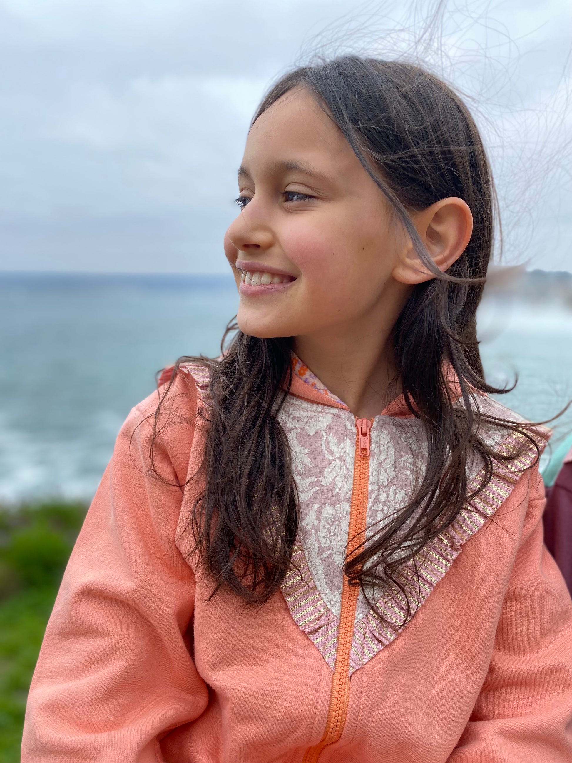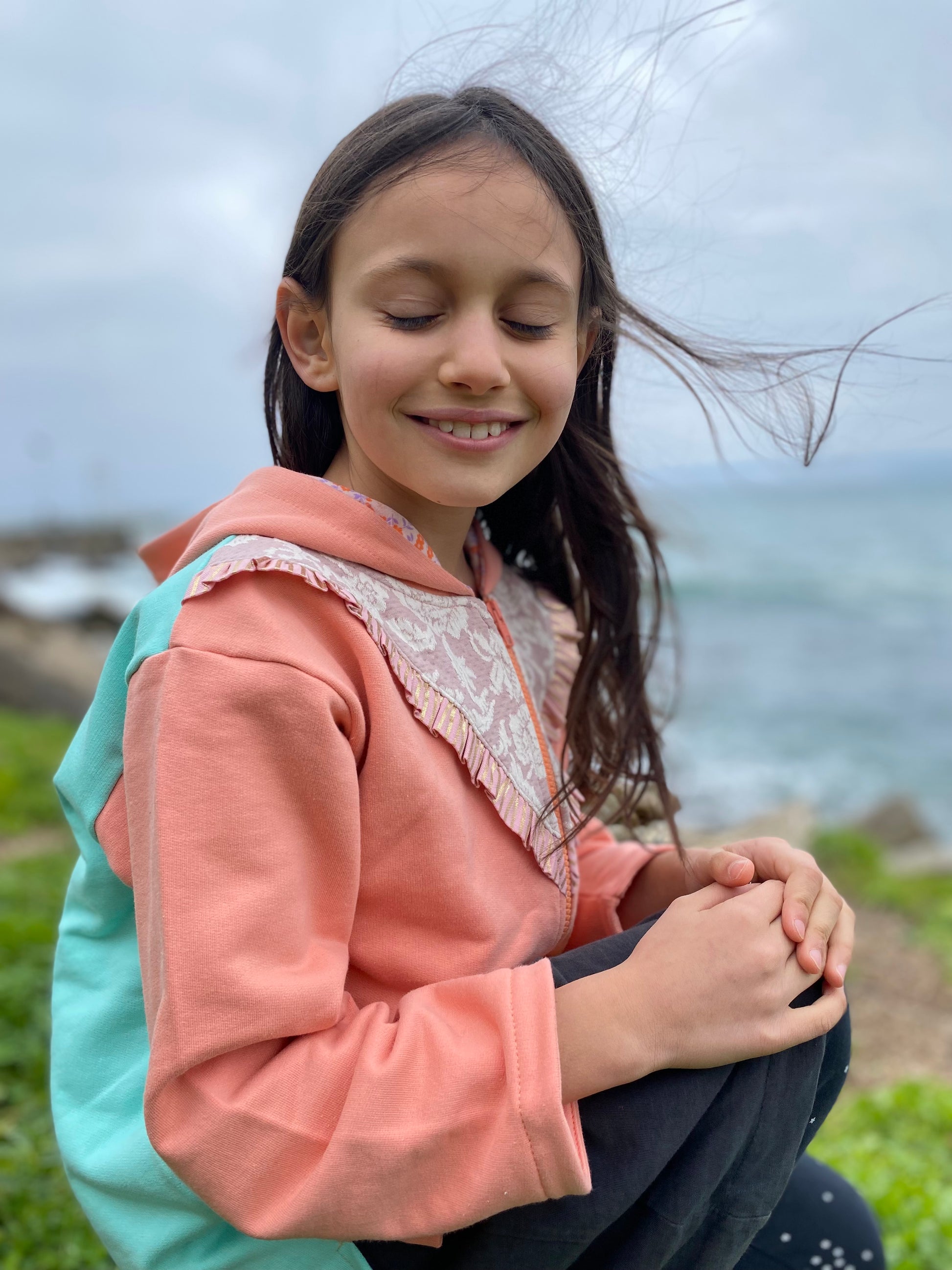 Polerón bicolor en tonos damasco viejo y verde agua. Confeccionado en suave franela con carda interior, cierre frontal, capucha forrada para mayor calidez y un delicado vuelo decorativo en tono rosa con un sutil brillo.