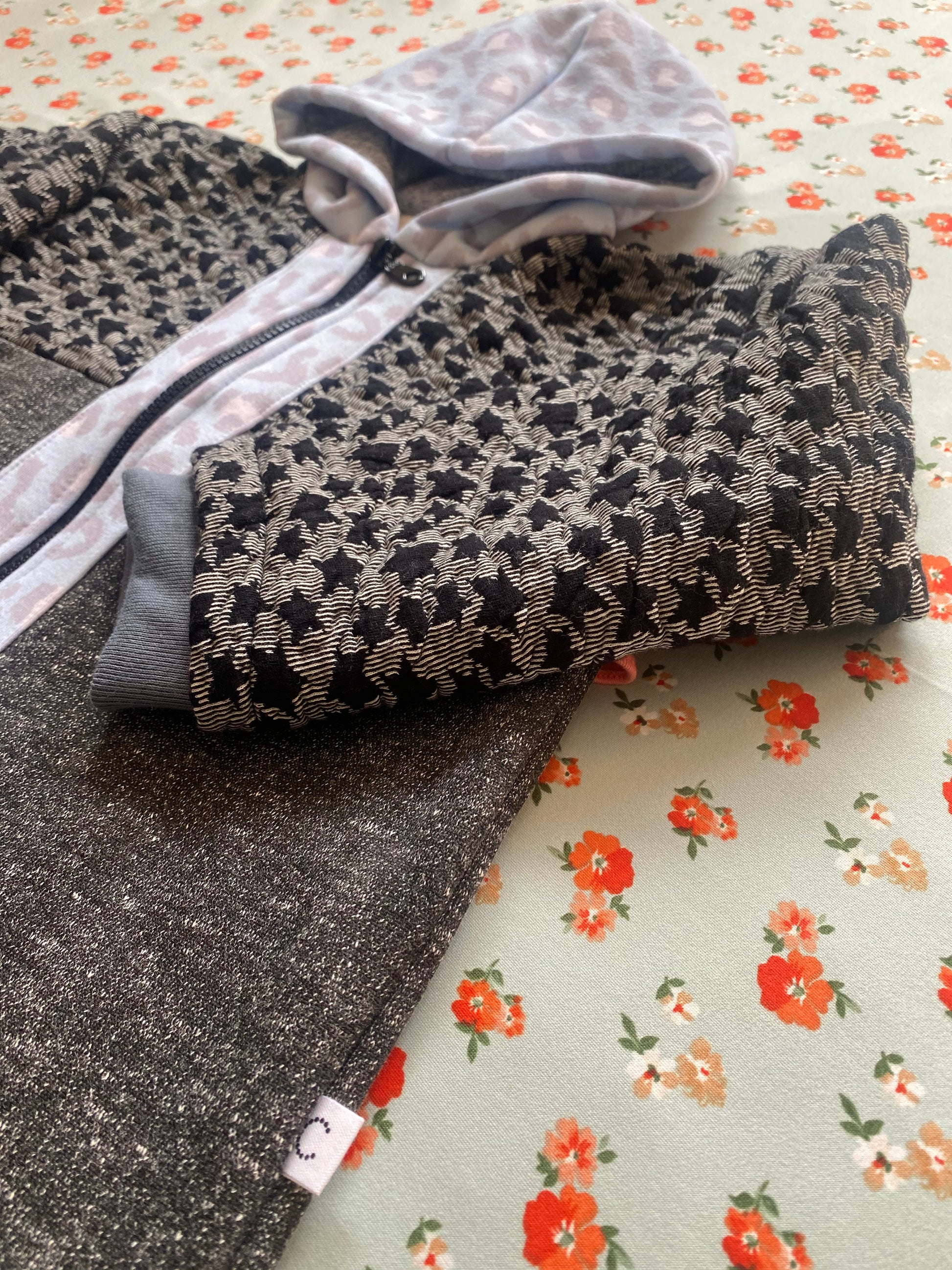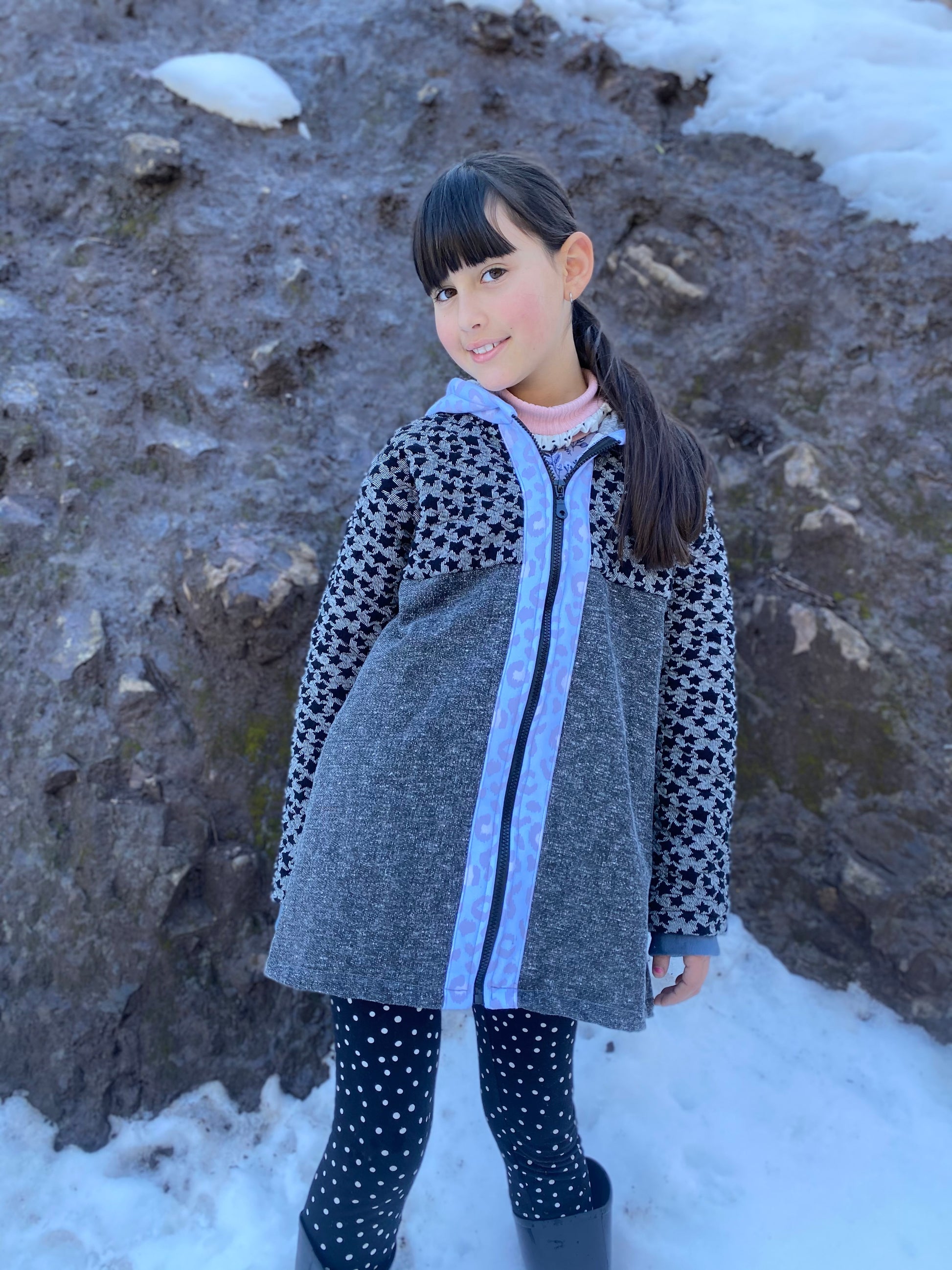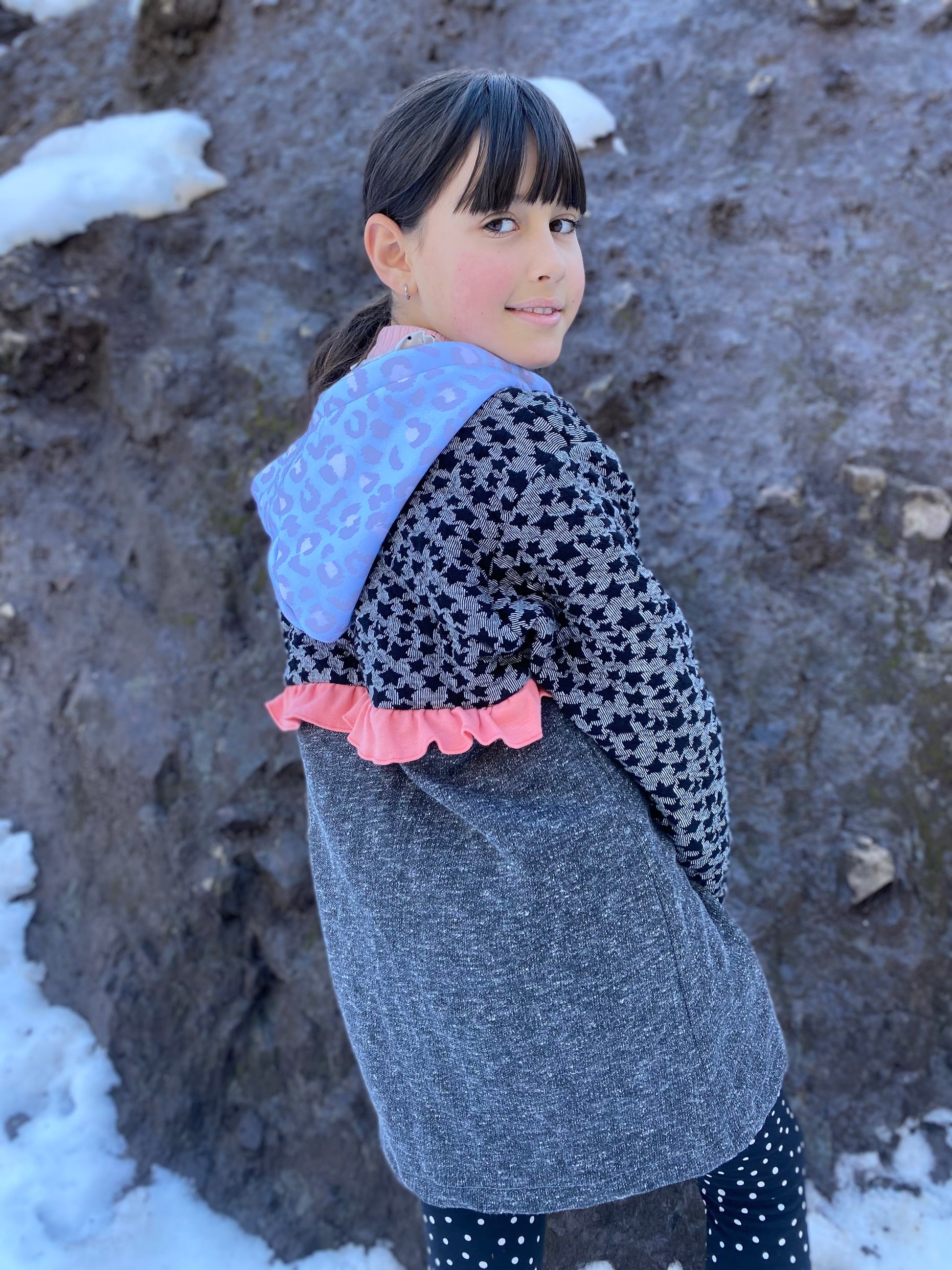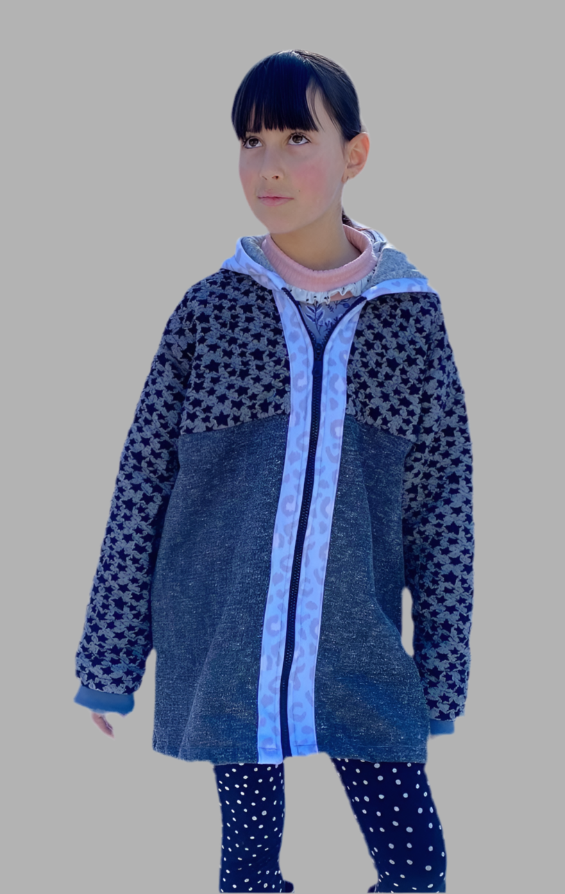 Chaqueta tipo polerón, largo con capucha en tonos negros y grises con estampado de estrellas, detalles en celeste, puños gris y vuelito color sandía en la espalda.