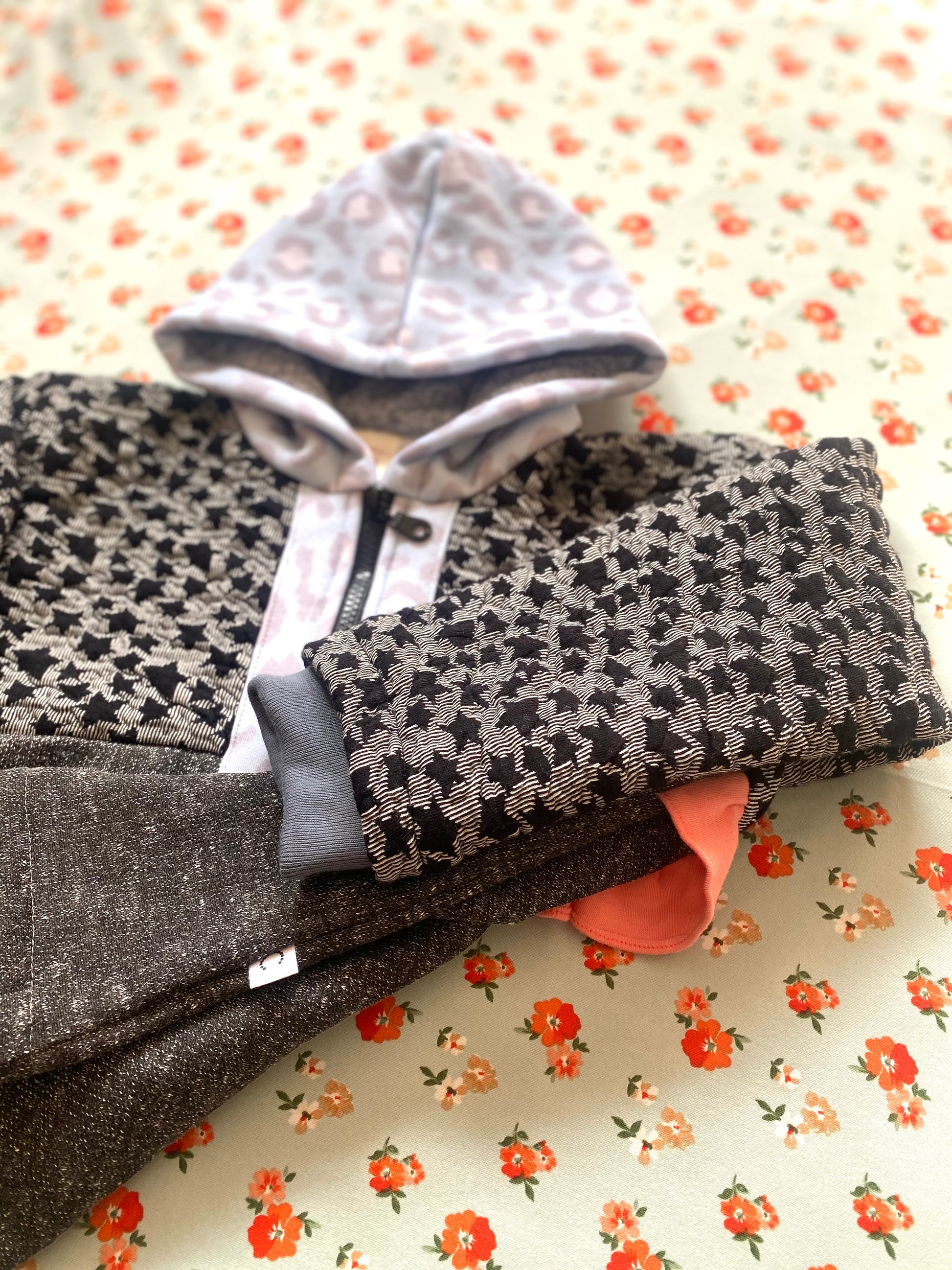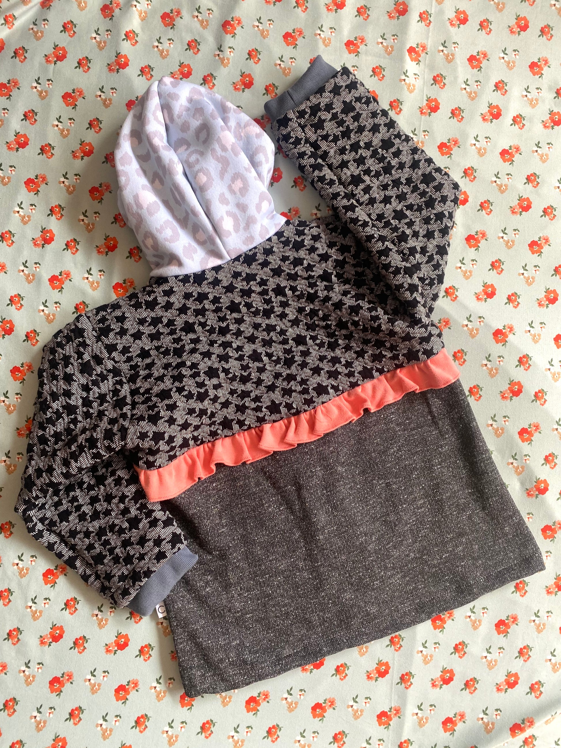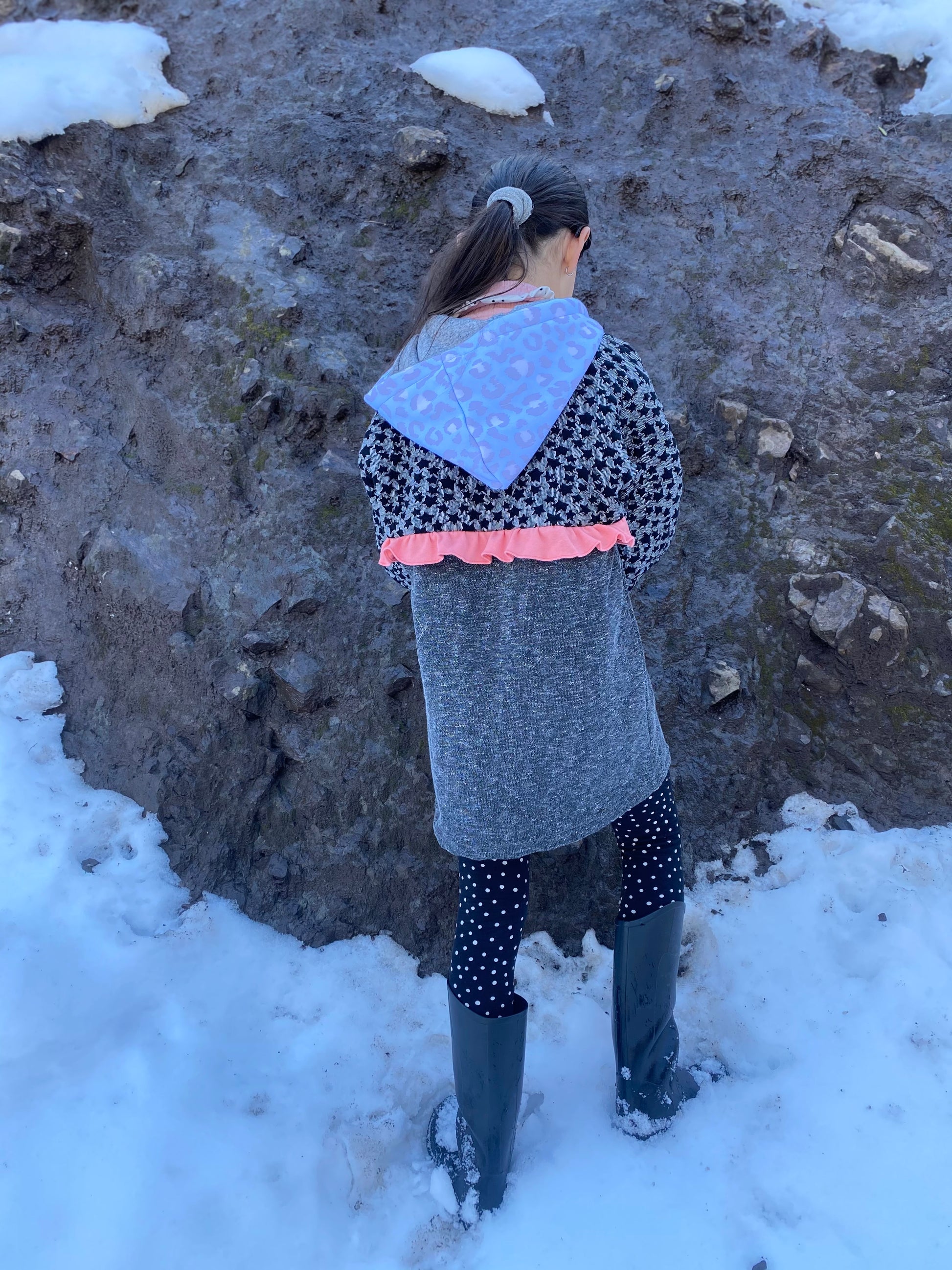 Chaqueta tipo polerón, largo con capucha en tonos negros y grises con estampado de estrellas, detalles en celeste, puños gris y vuelito color sandía en la espalda.
