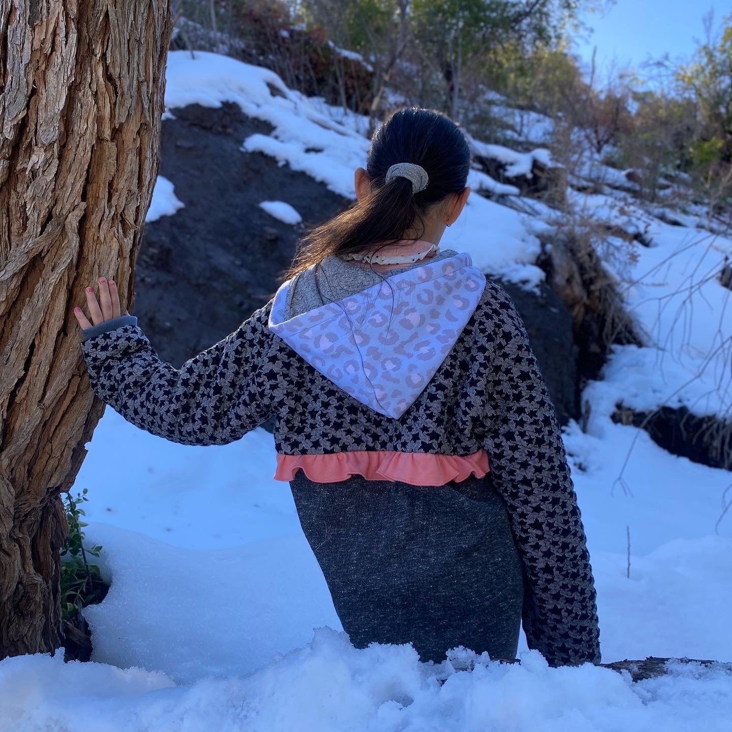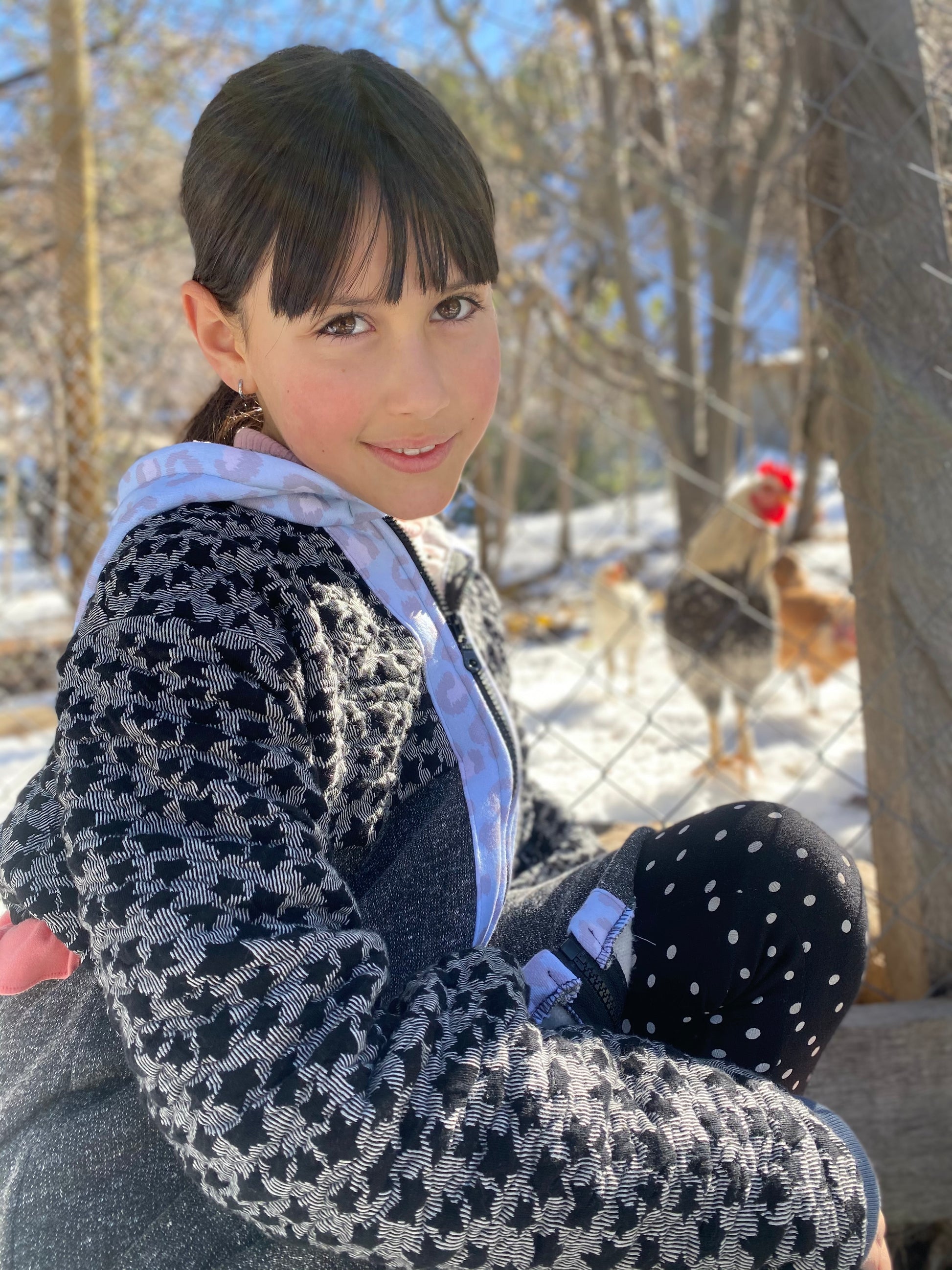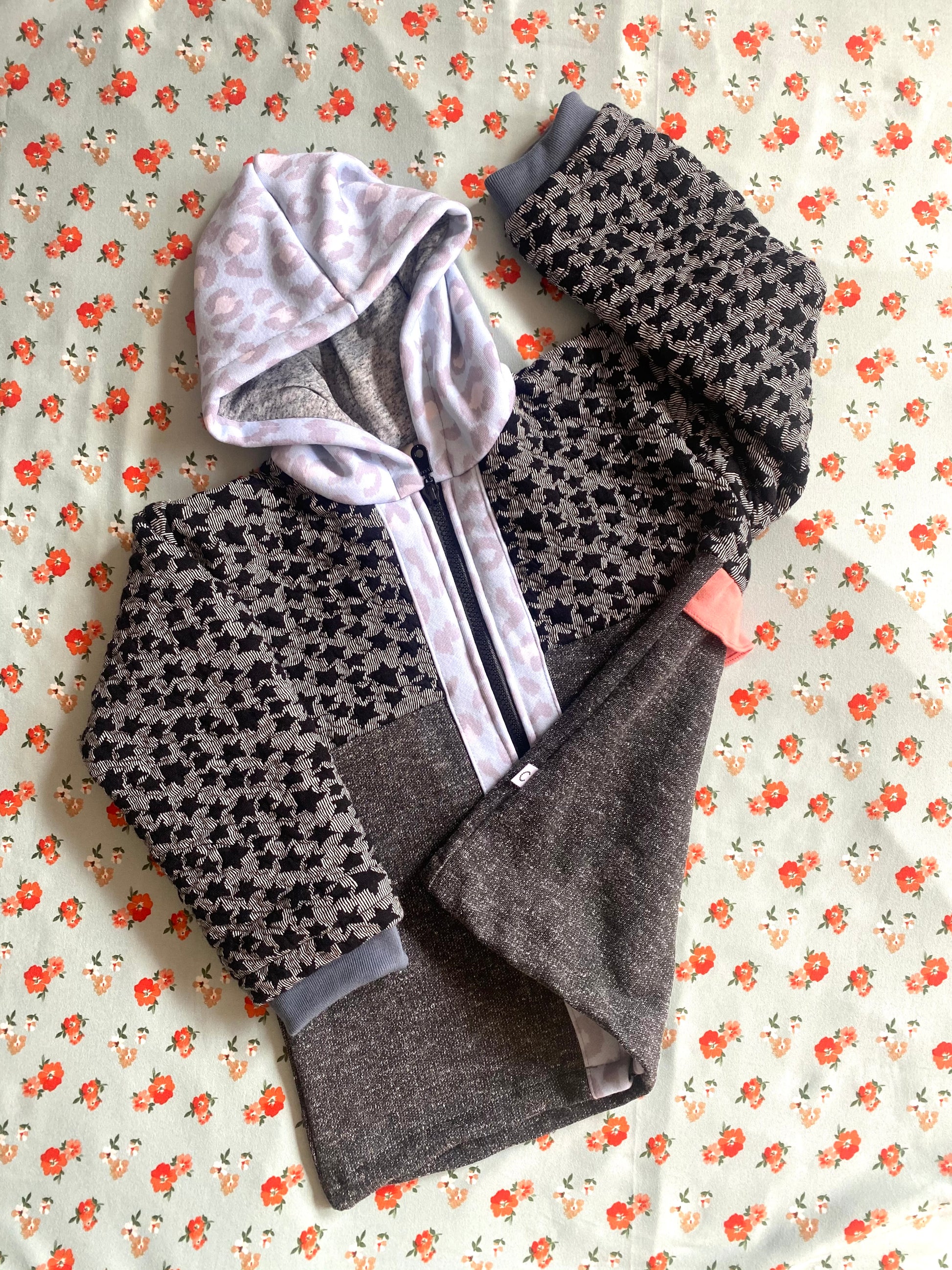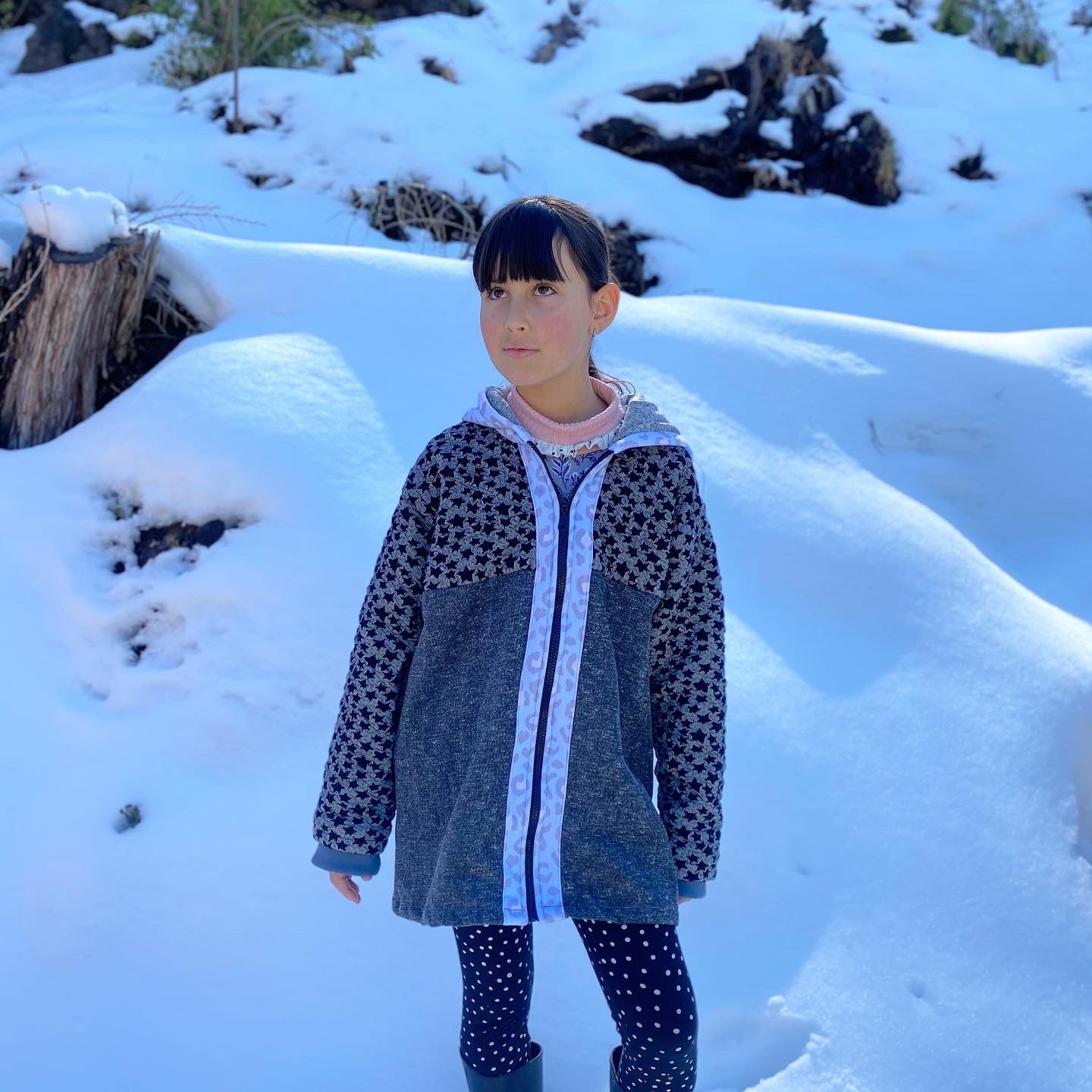 Chaqueta tipo polerón, largo con capucha en tonos negros y grises con estampado de estrellas, detalles en celeste, puños gris y vuelito color sandía en la espalda.