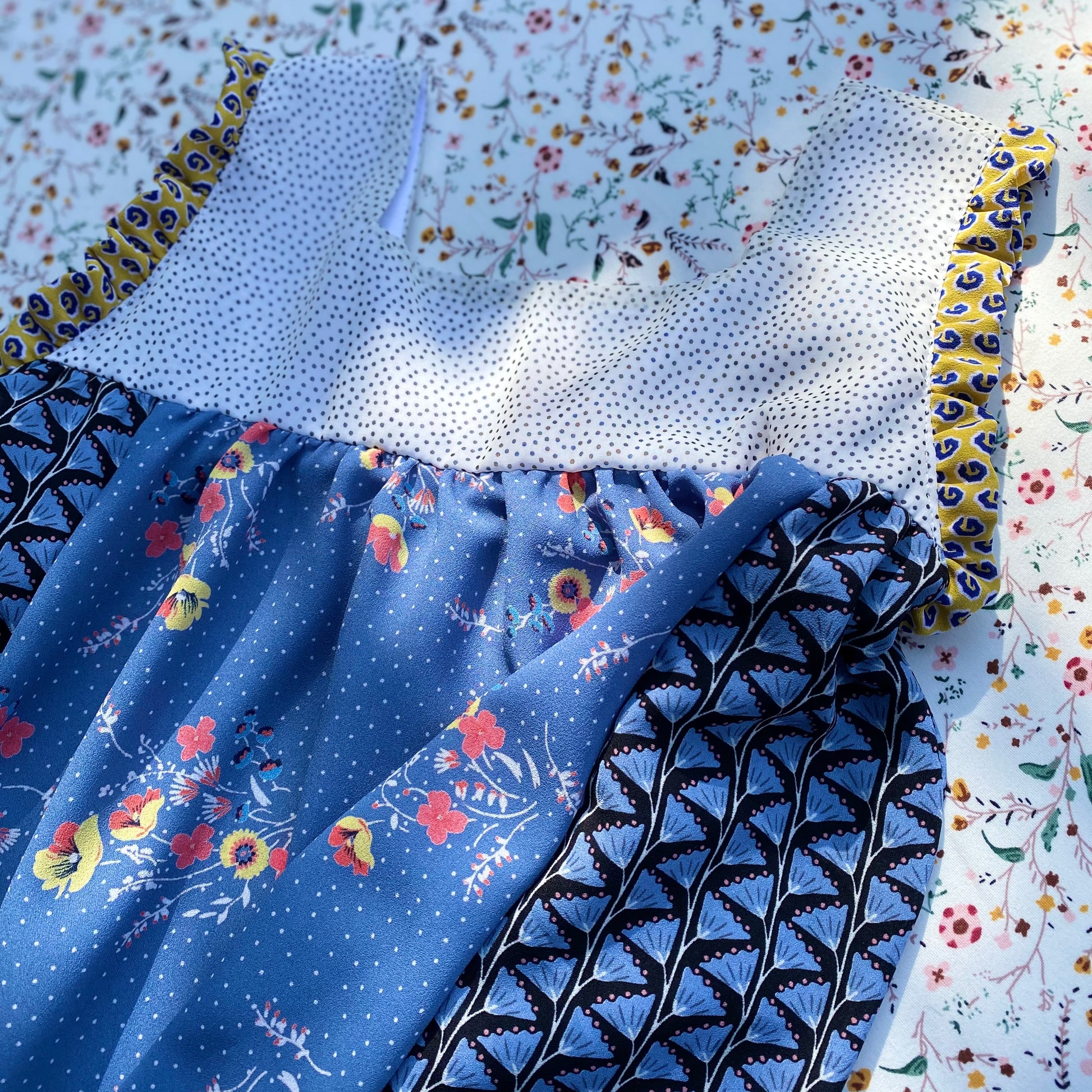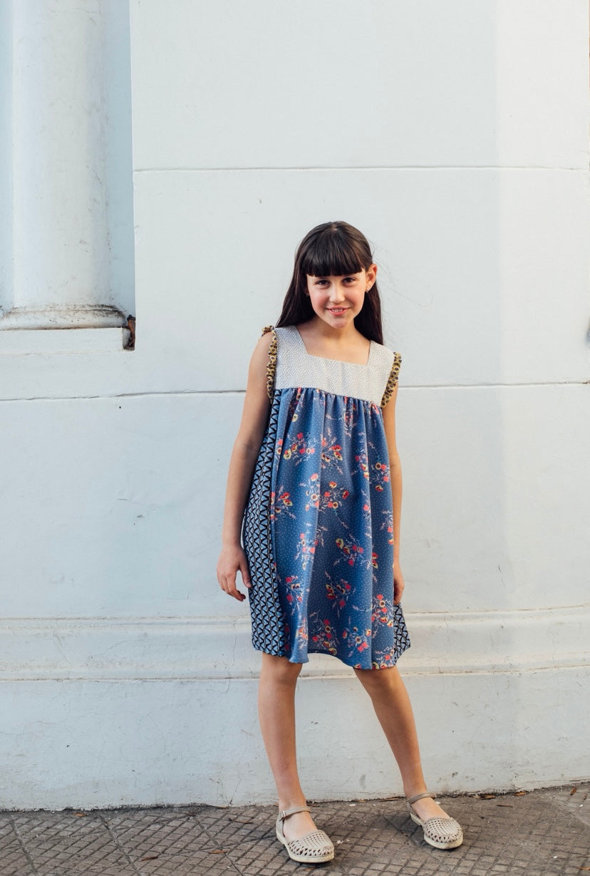 Vestido estampado en tonos azules, blanco y vuelitos amarillos.