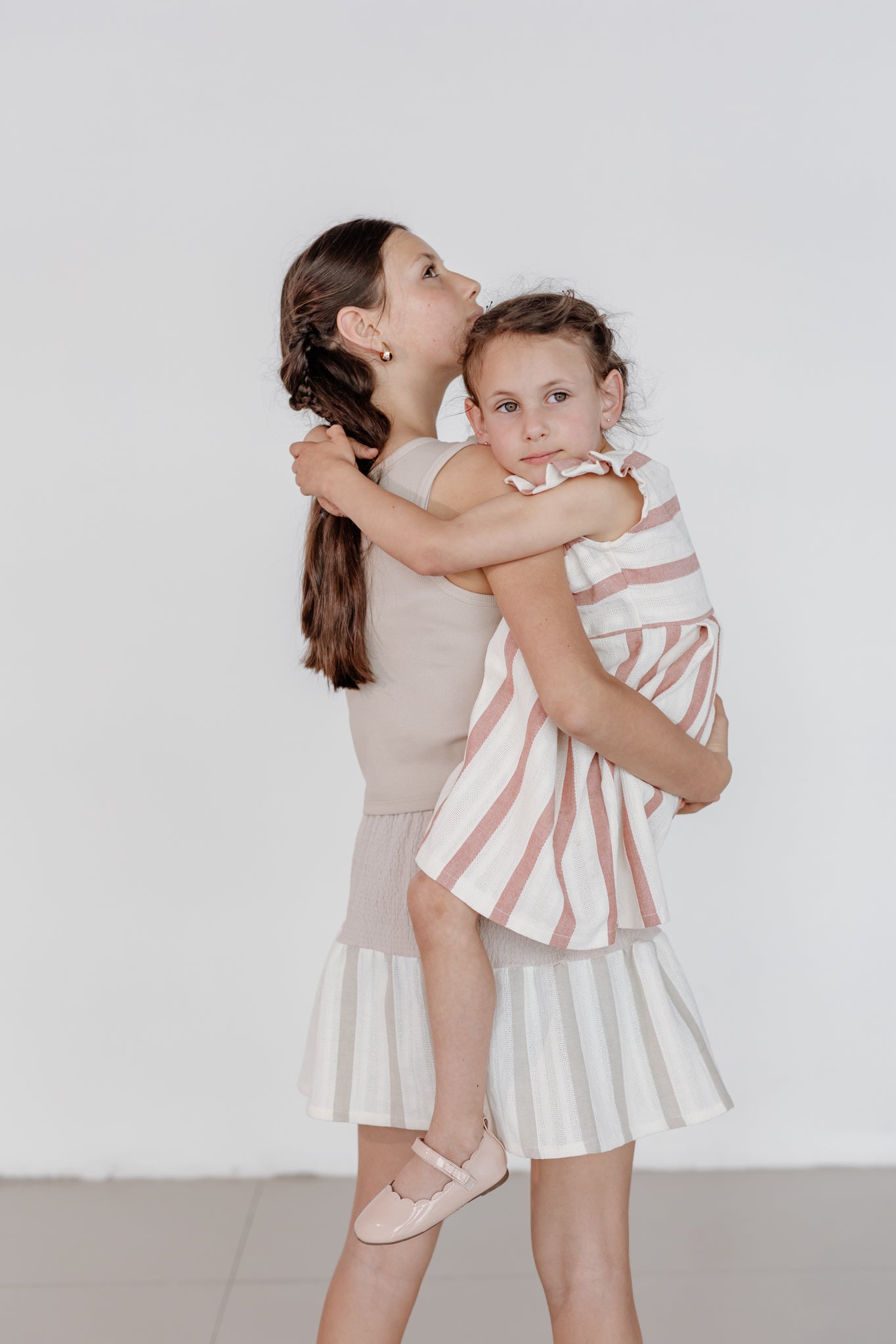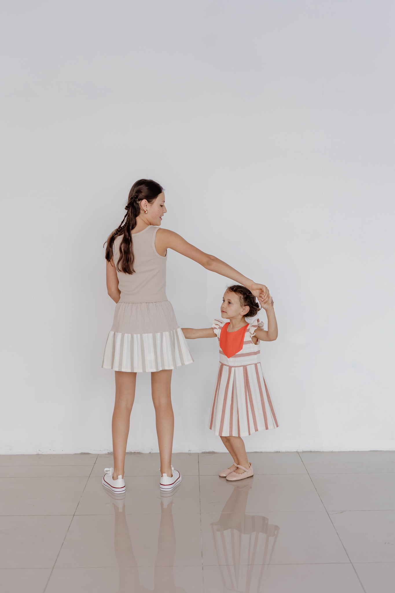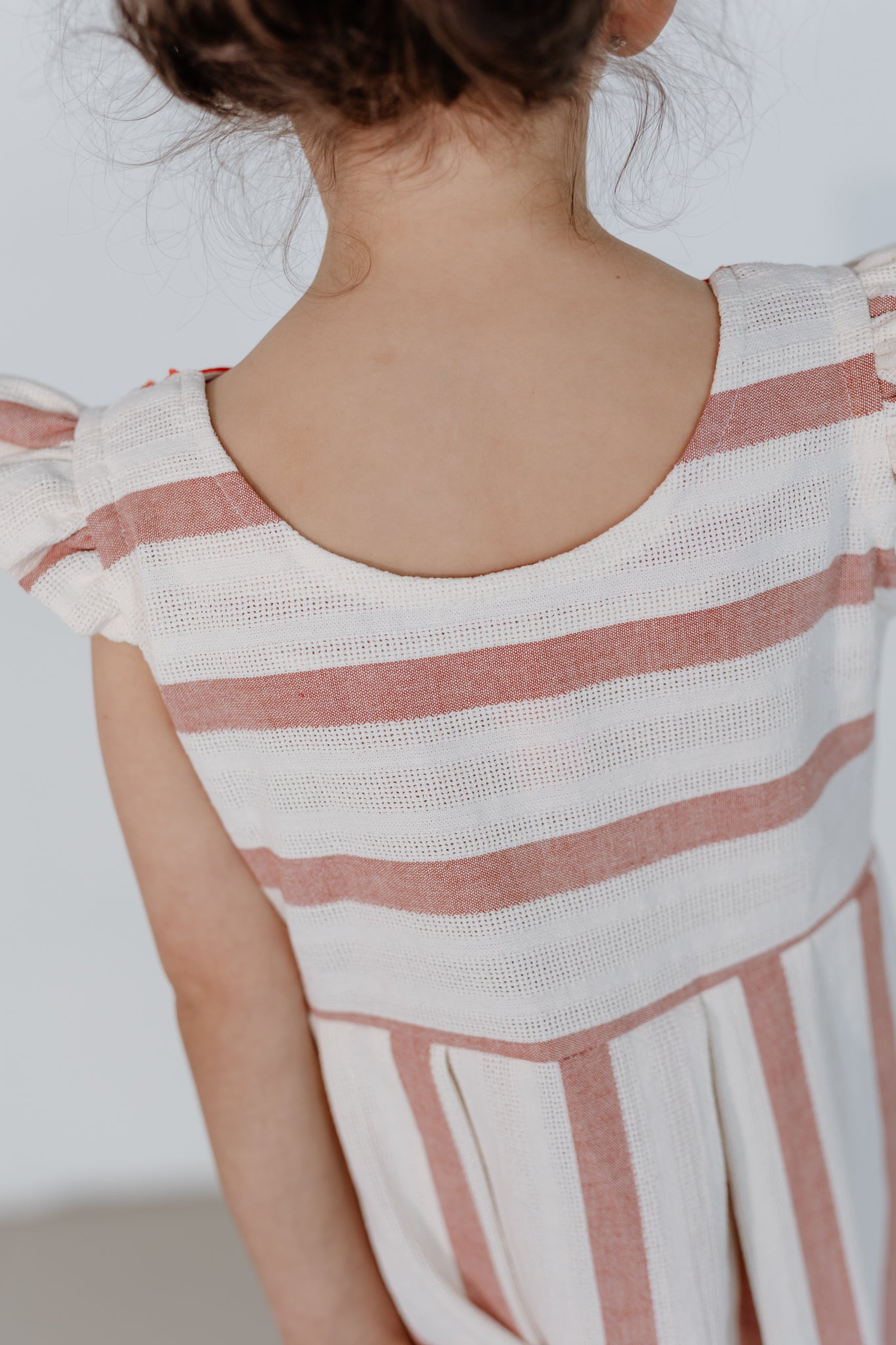 Vestido estampado a rayas en blanco invierno y terracota, con una falda tableada y un canesú texturizado en tono rojo anaranjado.