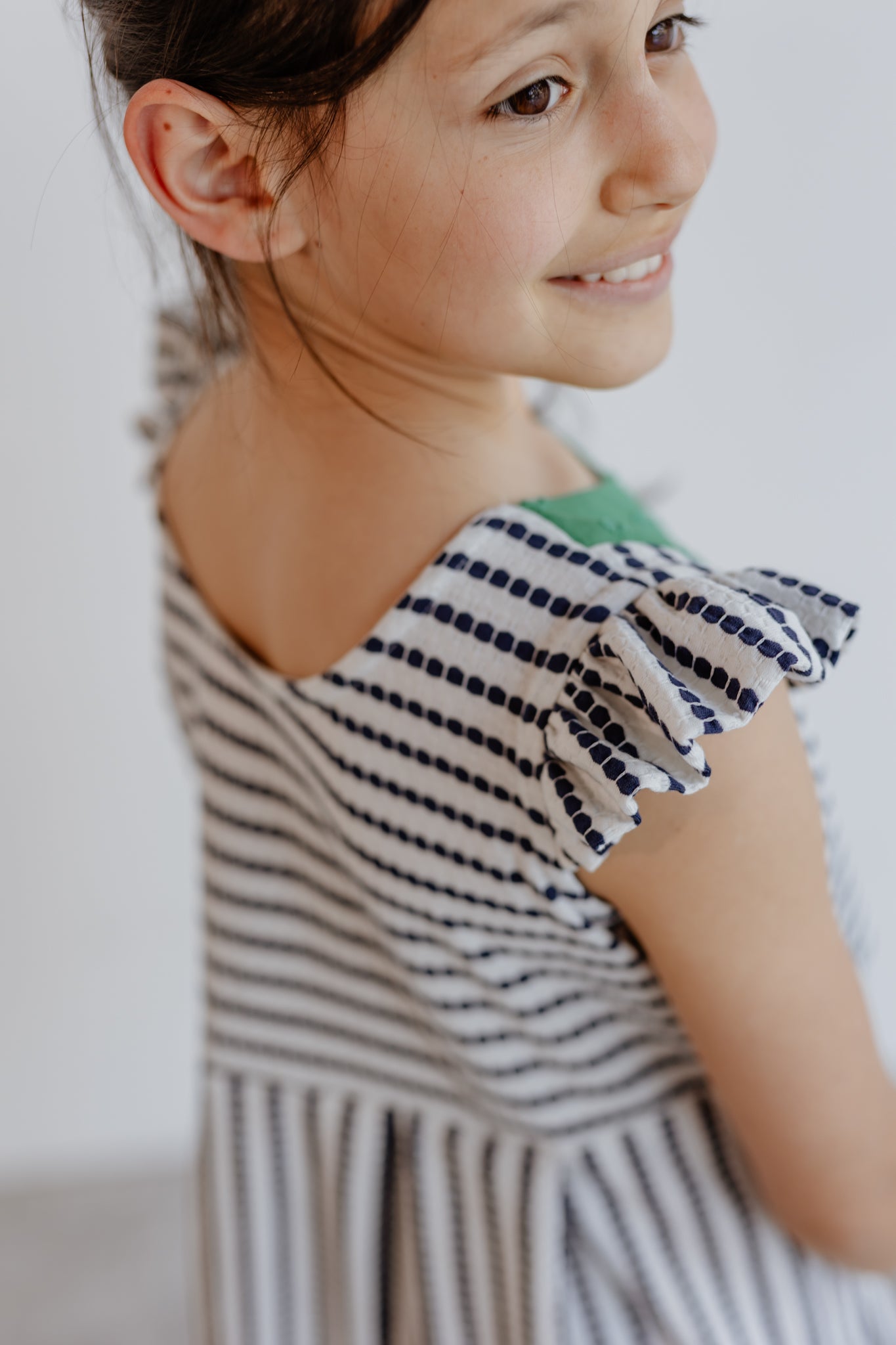 Vestido estampado en blanco y azul, con una falda tableada y un canesú texturizado en tono verde.