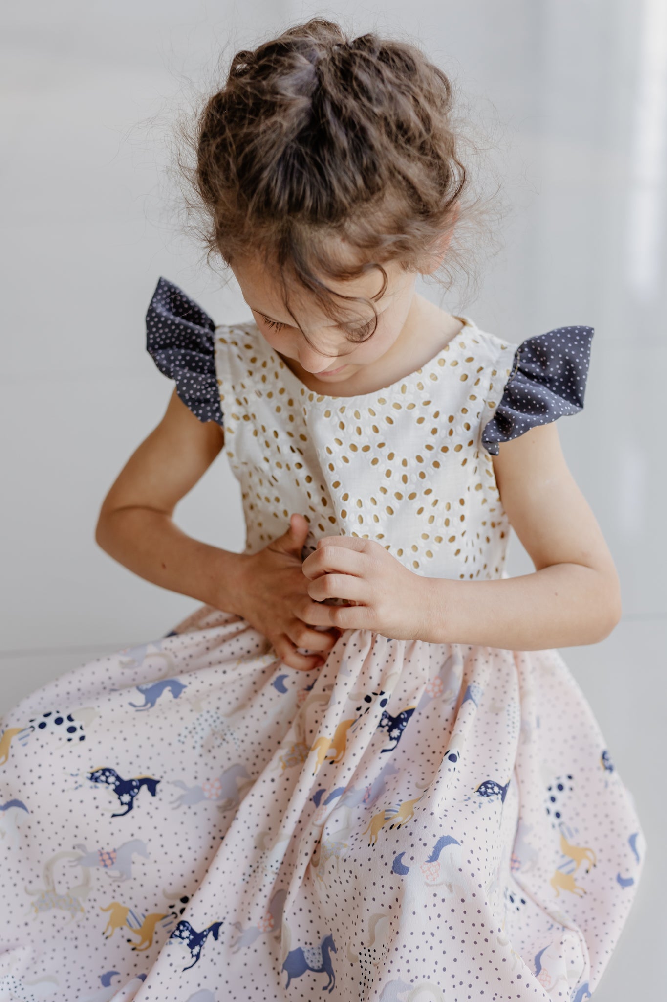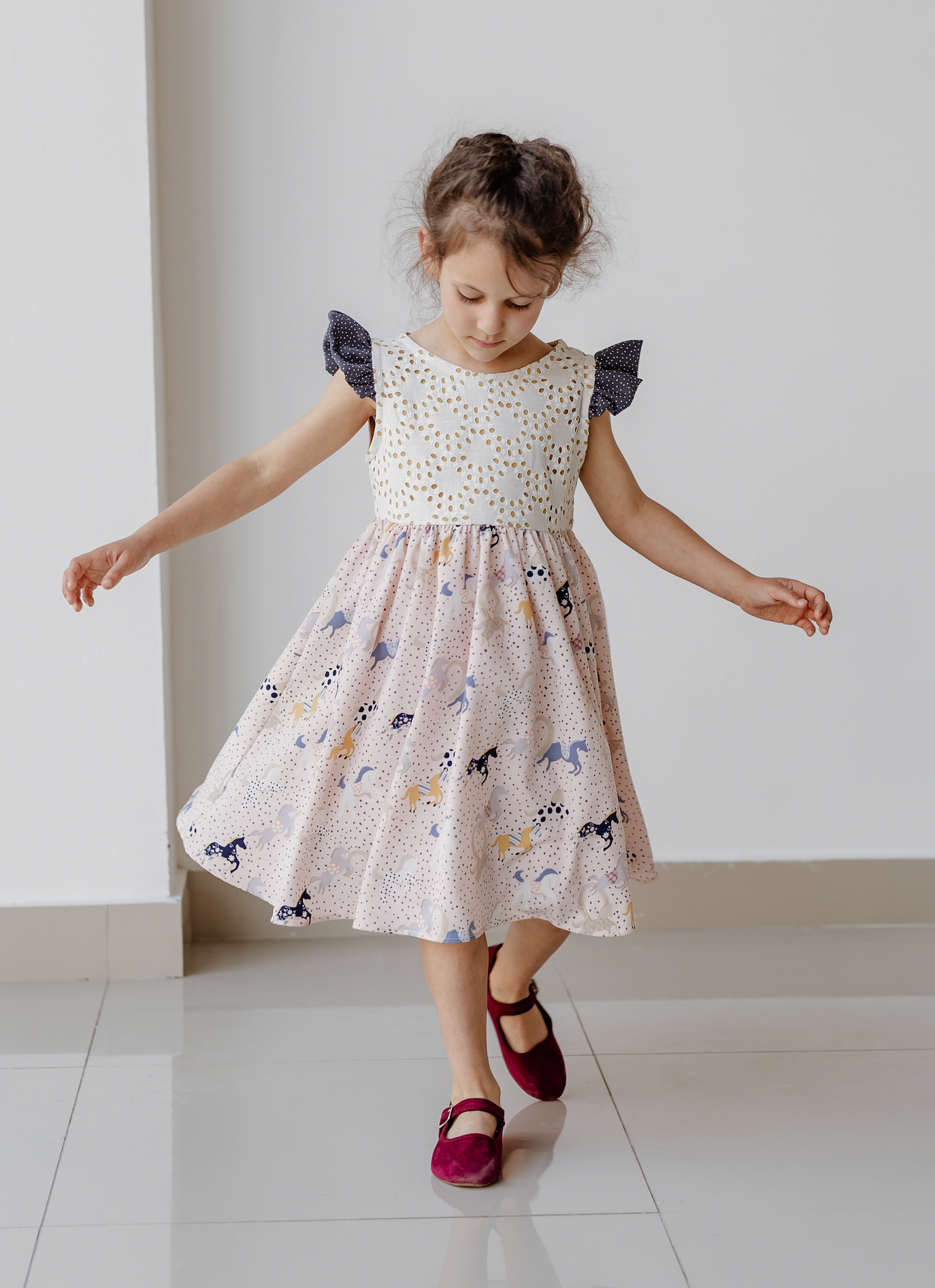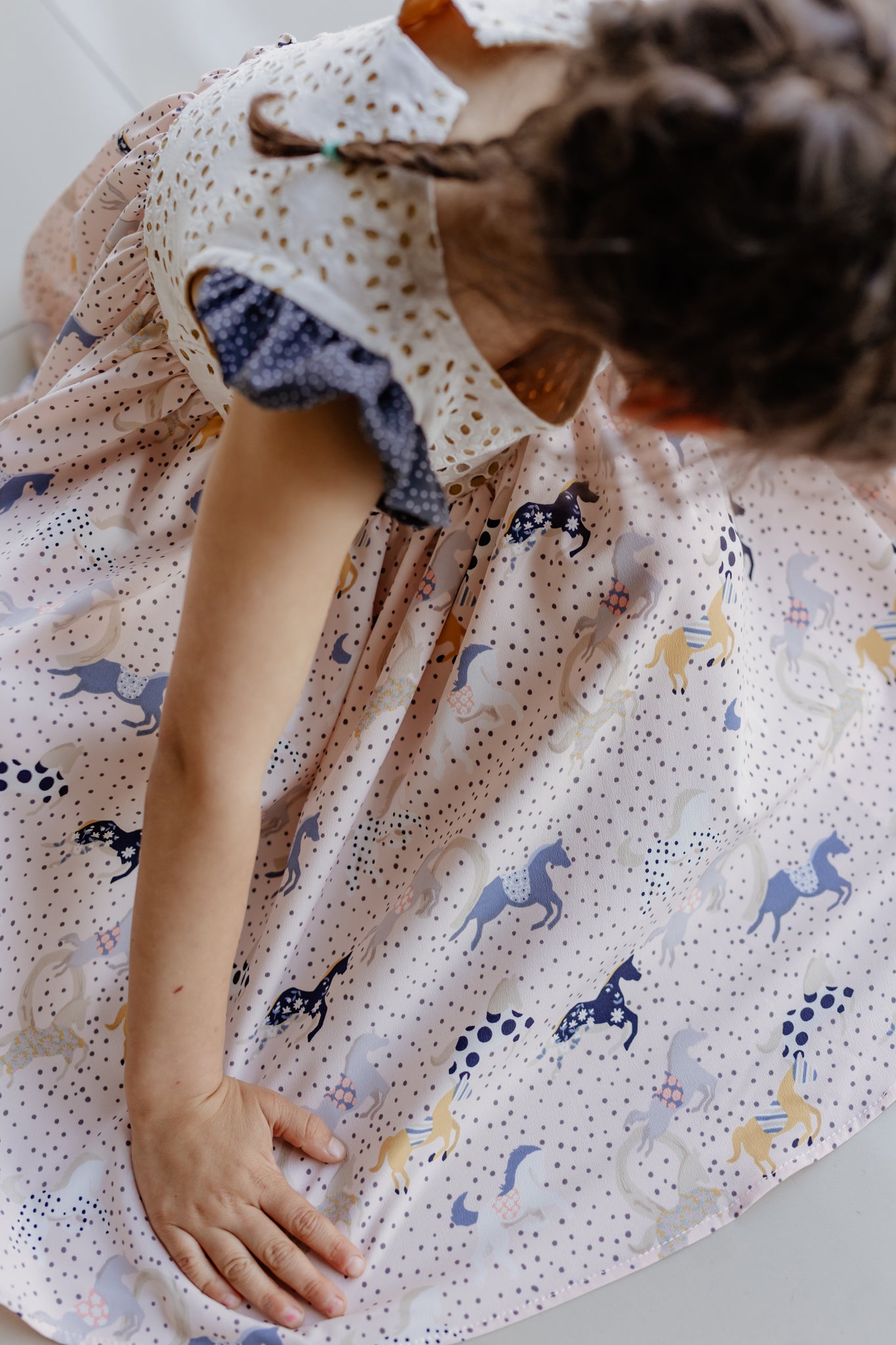 Vestido rosa y blanco con una amplia falda estampada de caballitos, canesú en broderie y mangas con delicados vuelitos de lunares.