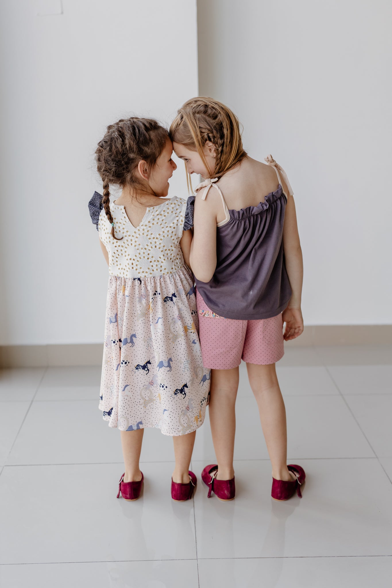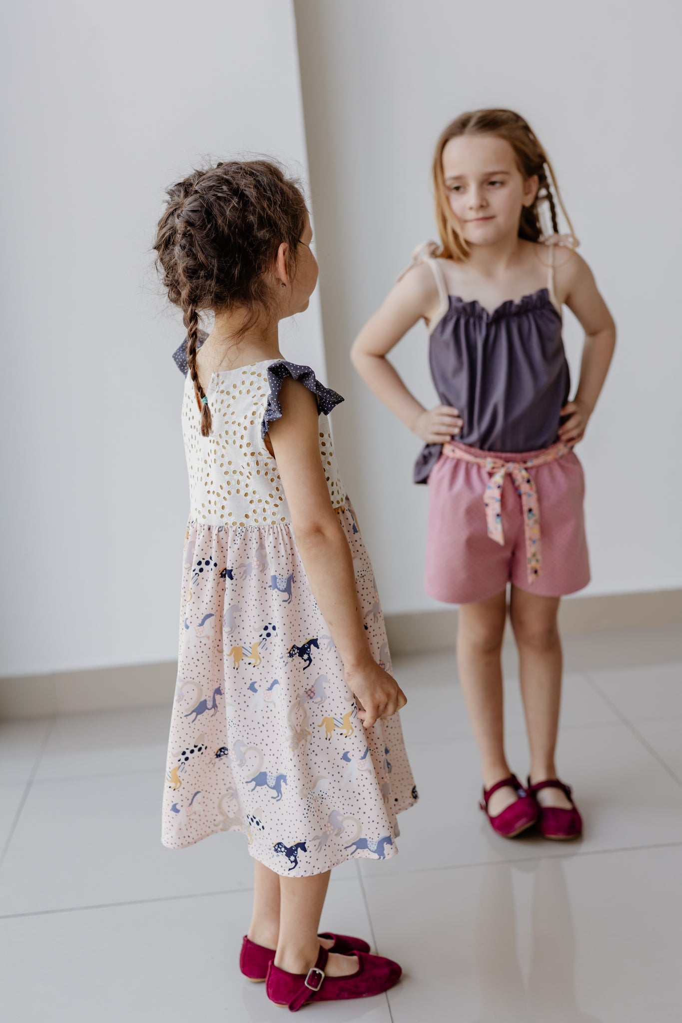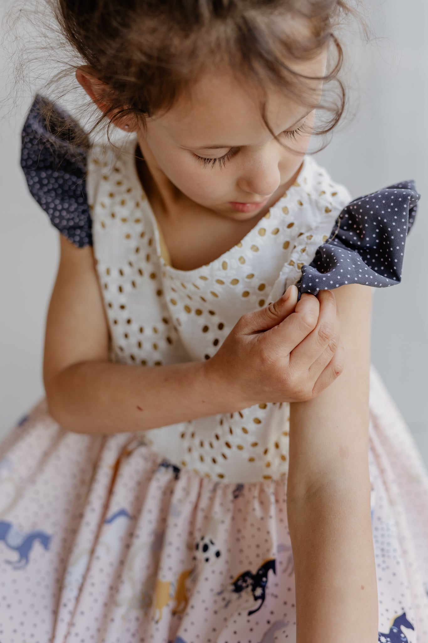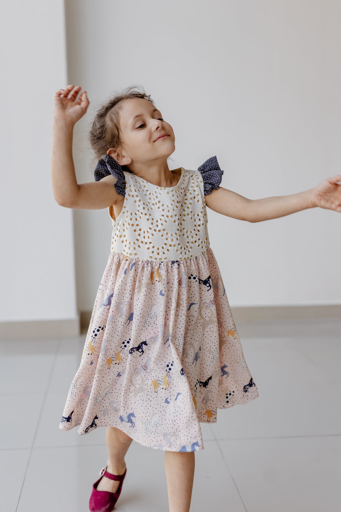 Vestido rosa y blanco con una amplia falda estampada de caballitos, canesú en broderie y mangas con delicados vuelitos de lunares.