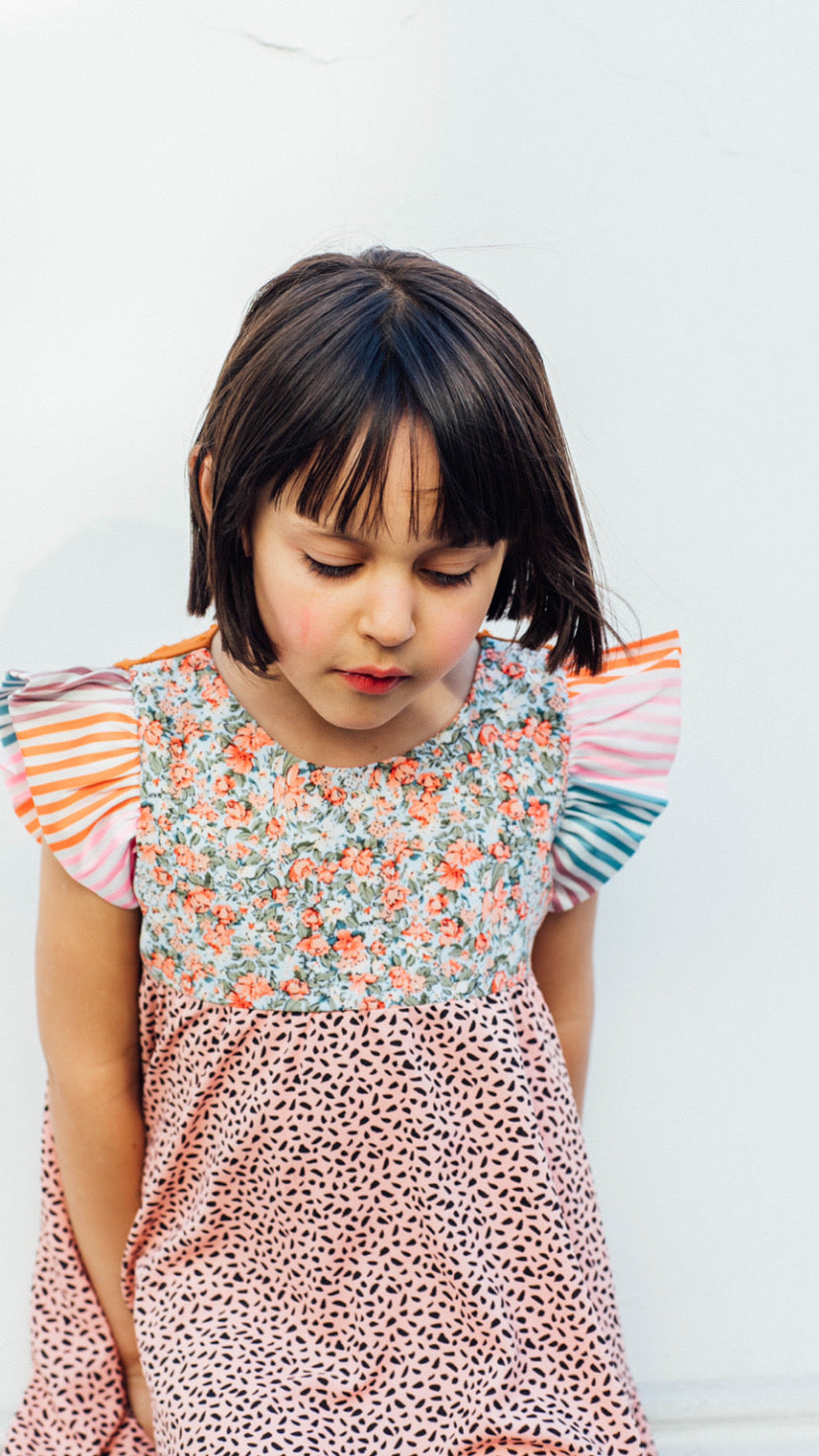 Vestido estampado multicolor con falda de ruedo amplio, canesú forrado en algodón y manguitas de vuelitos.