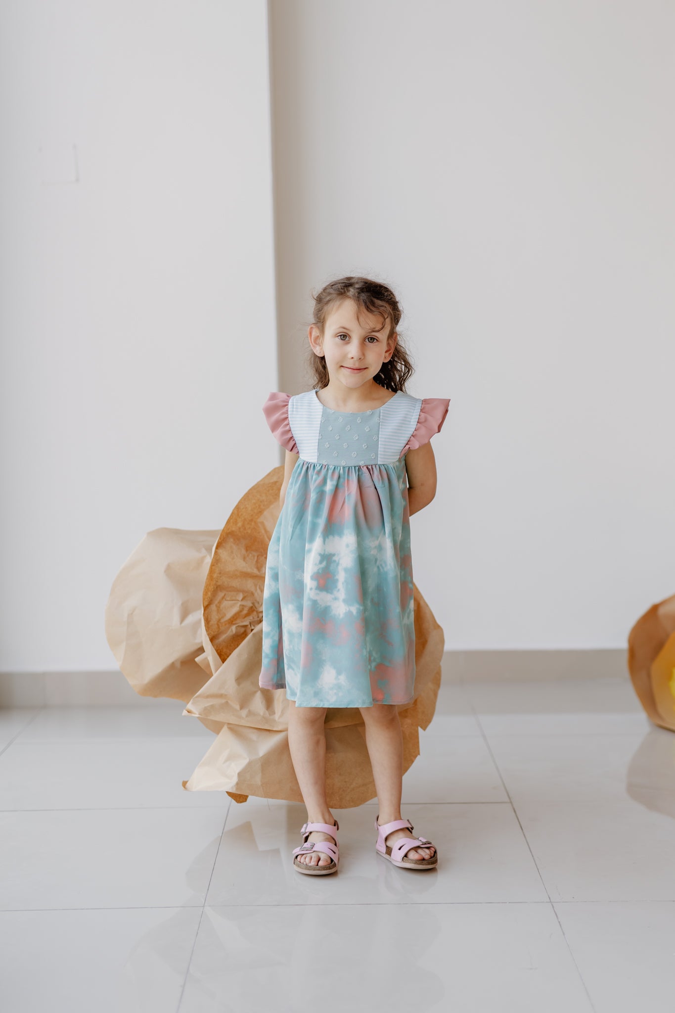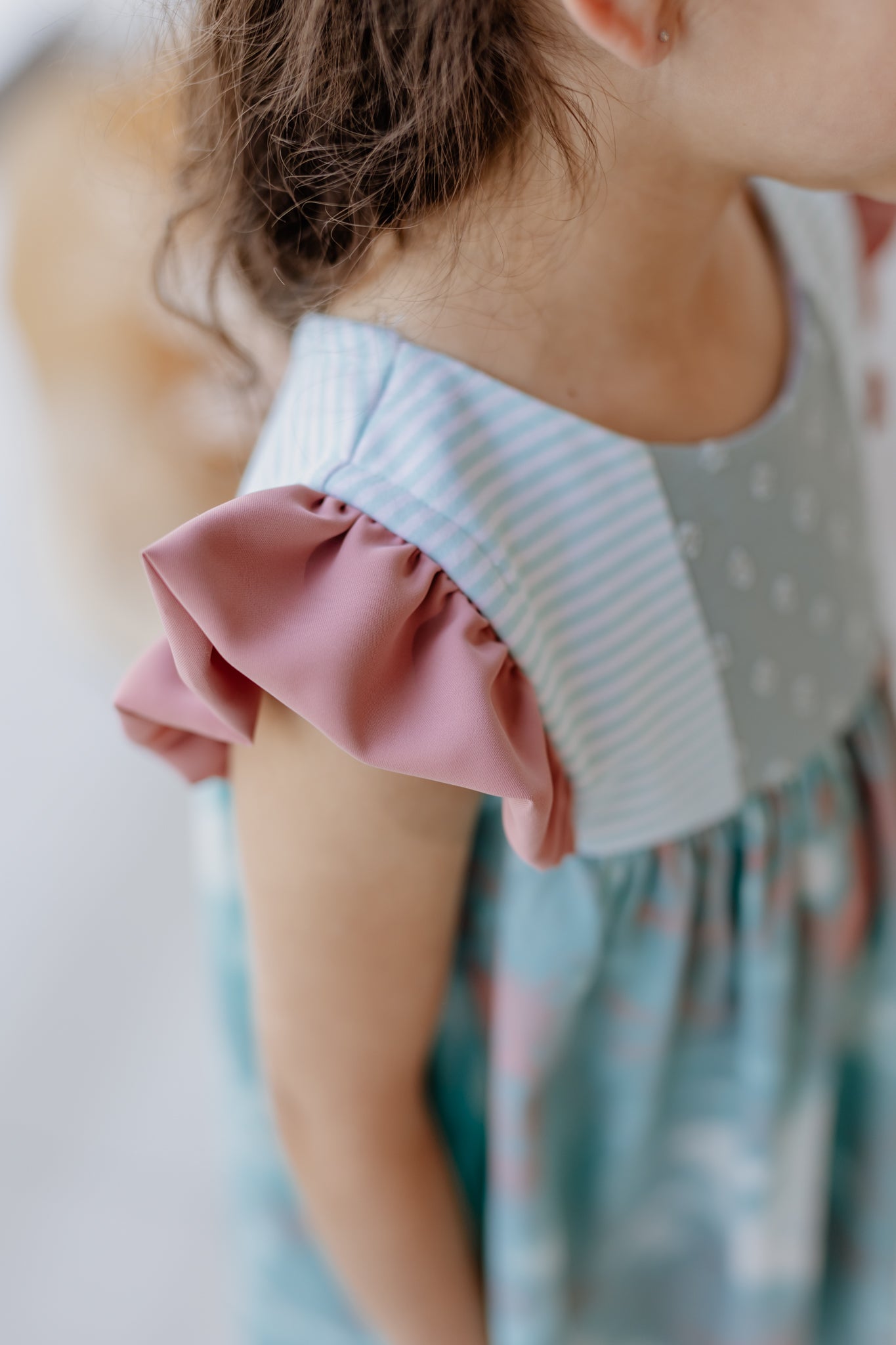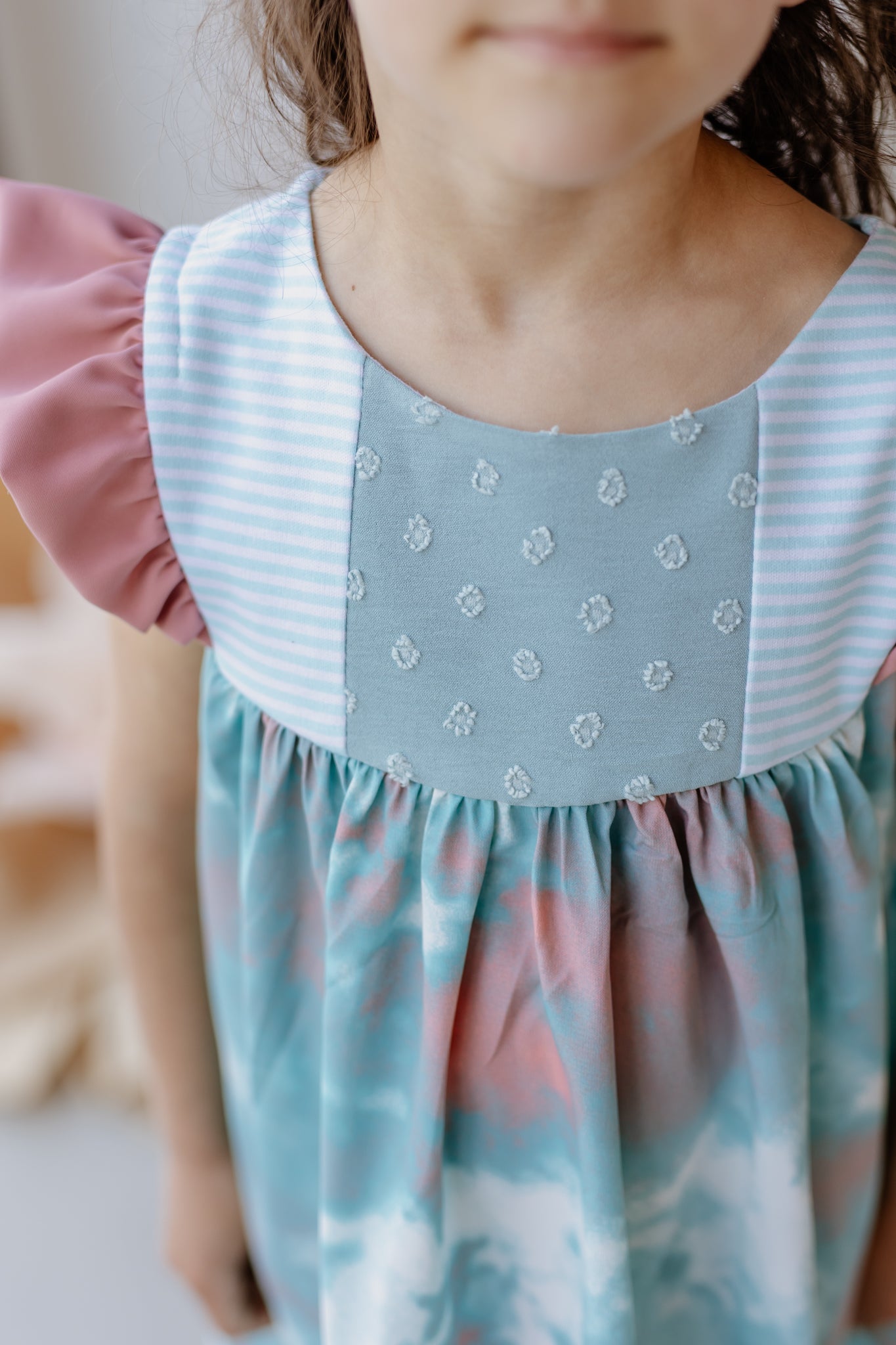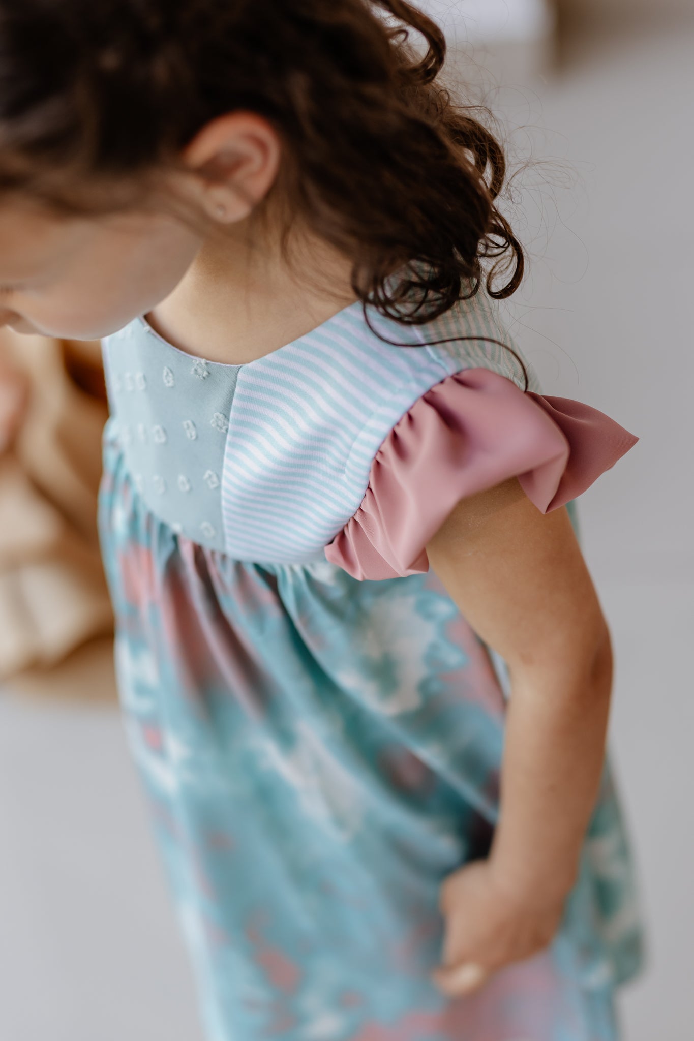 Vestido estampado en tonos celeste, blanco y rosa, con canesú texturado forrado y mangas cortas con delicados vuelos.