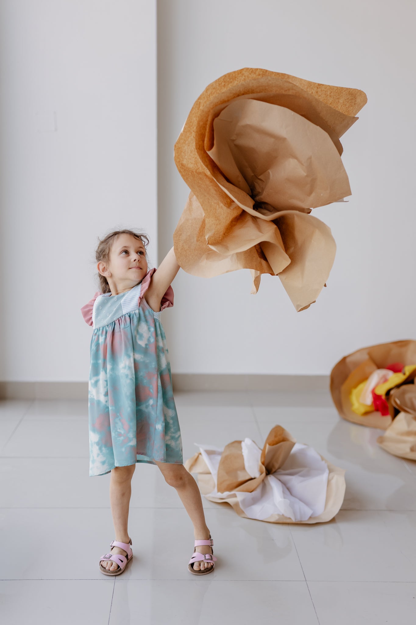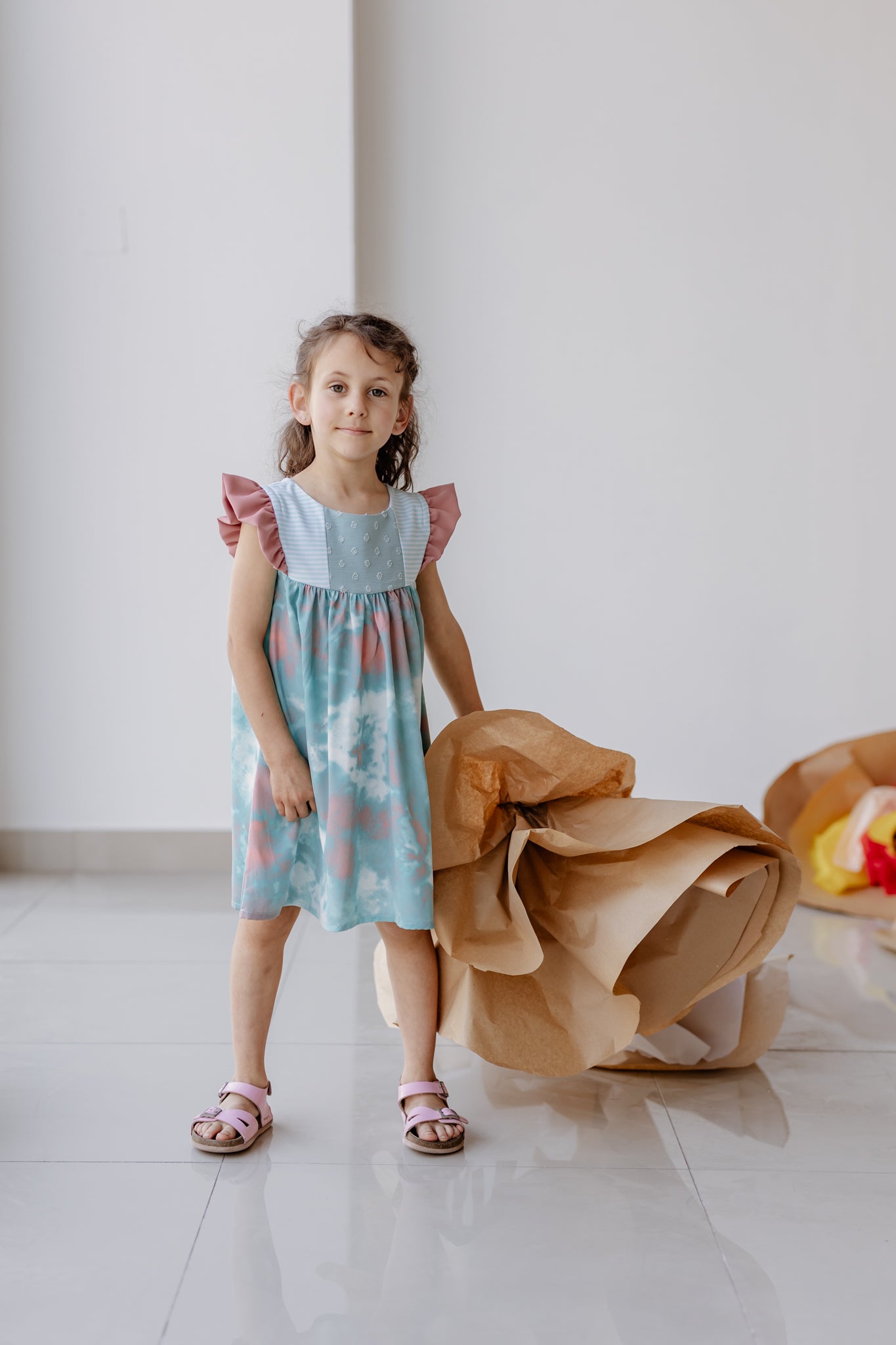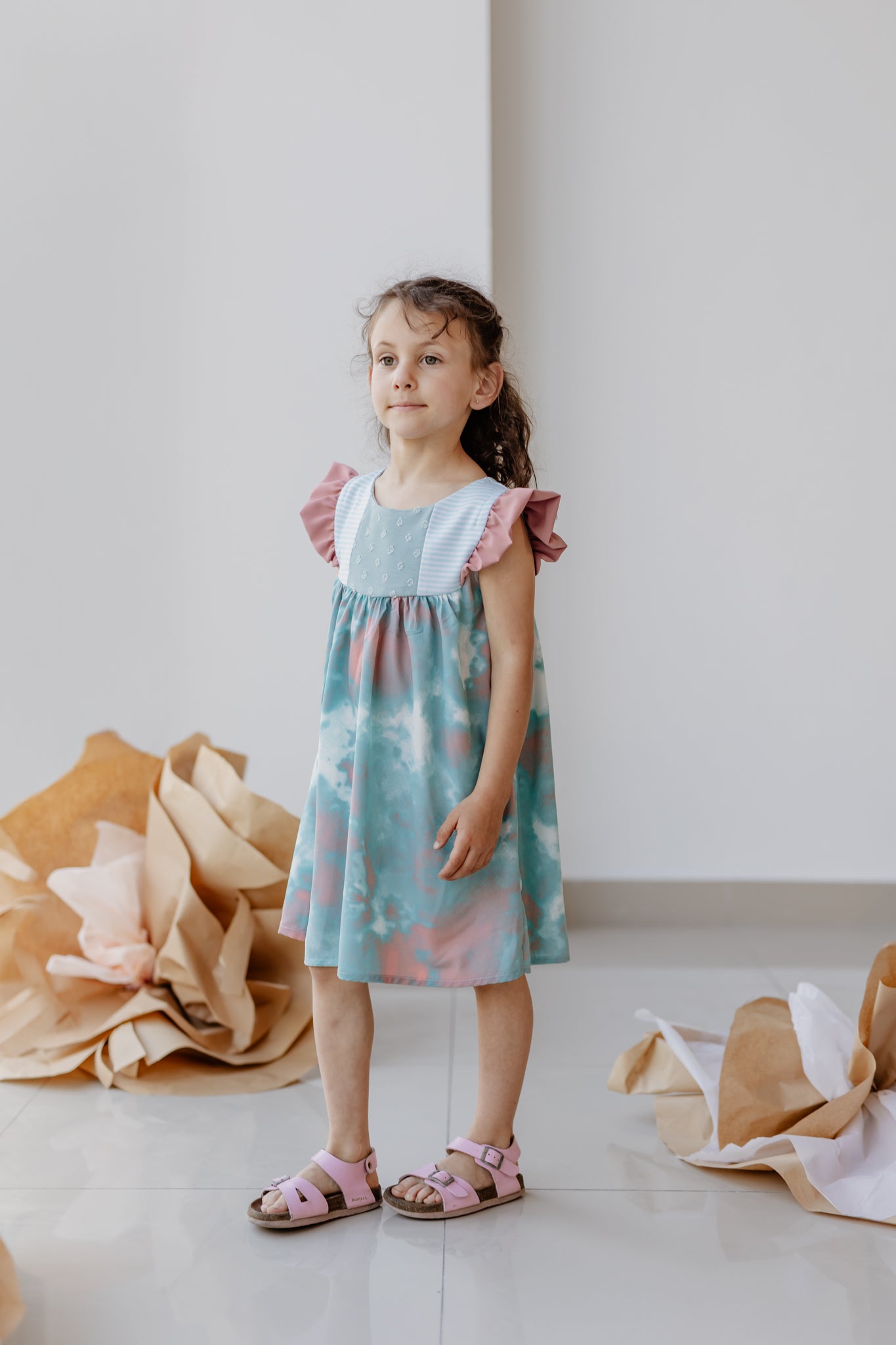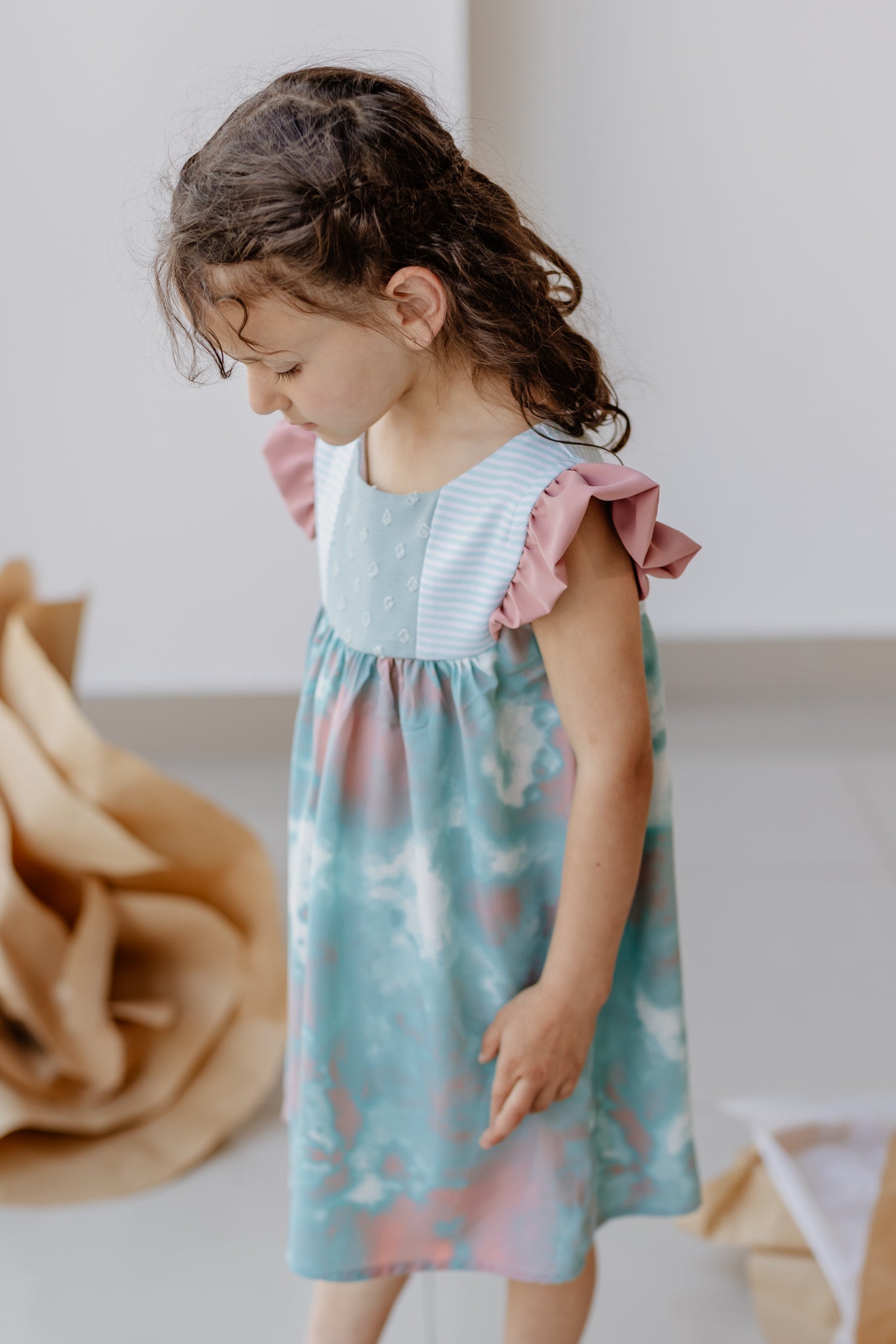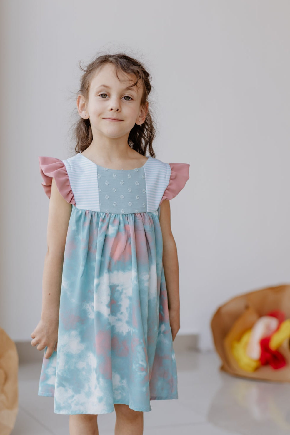 Vestido estampado en tonos celeste, blanco y rosa, con canesú texturado forrado y mangas cortas con delicados vuelos.