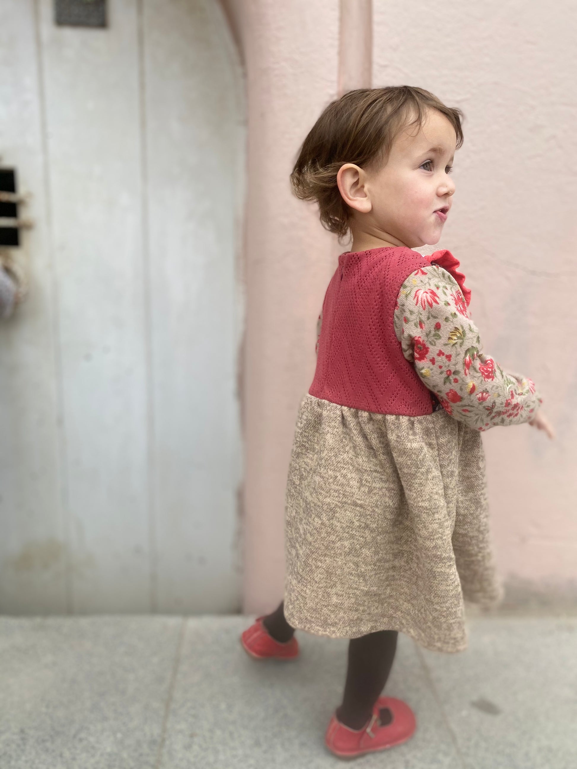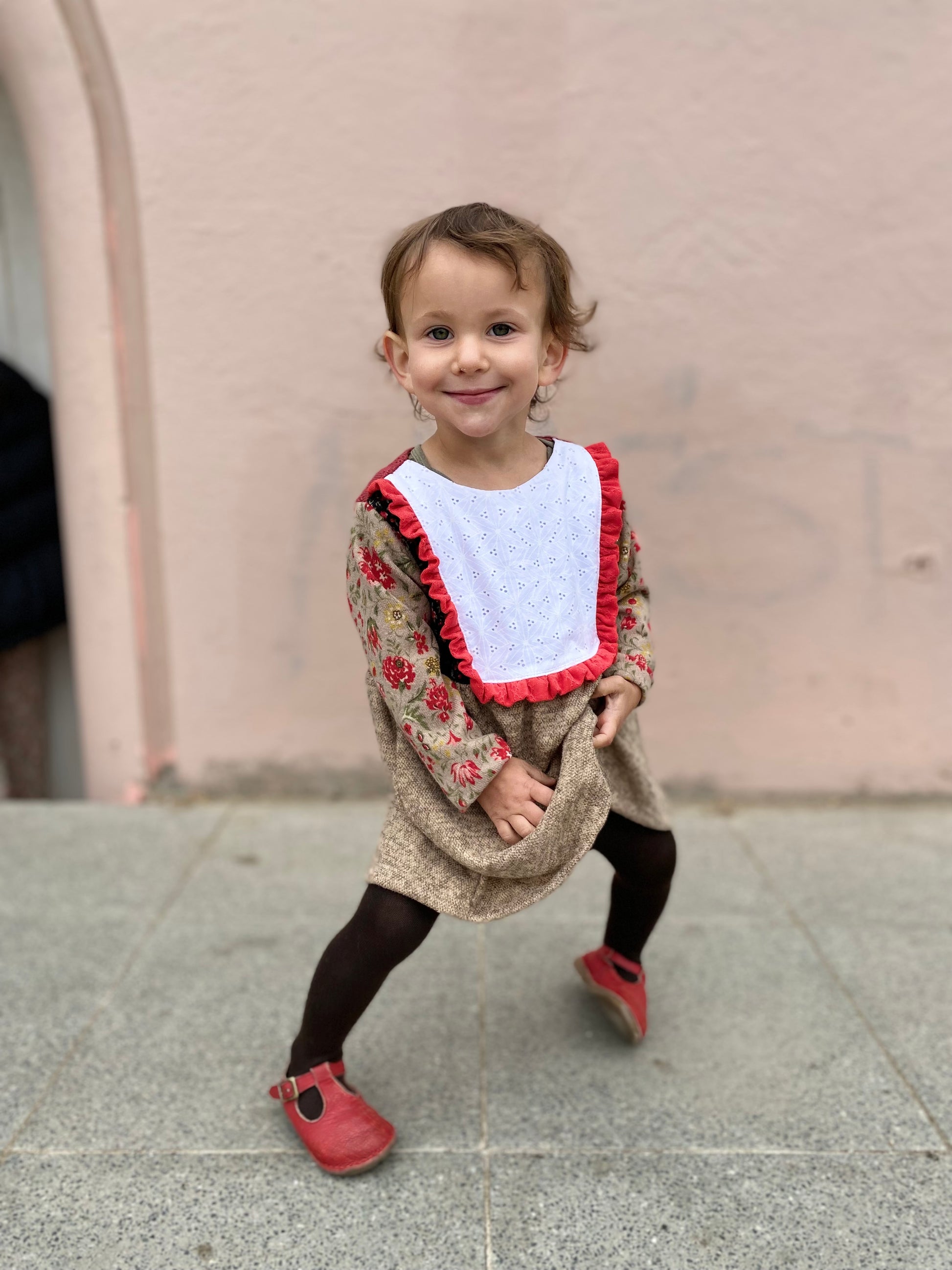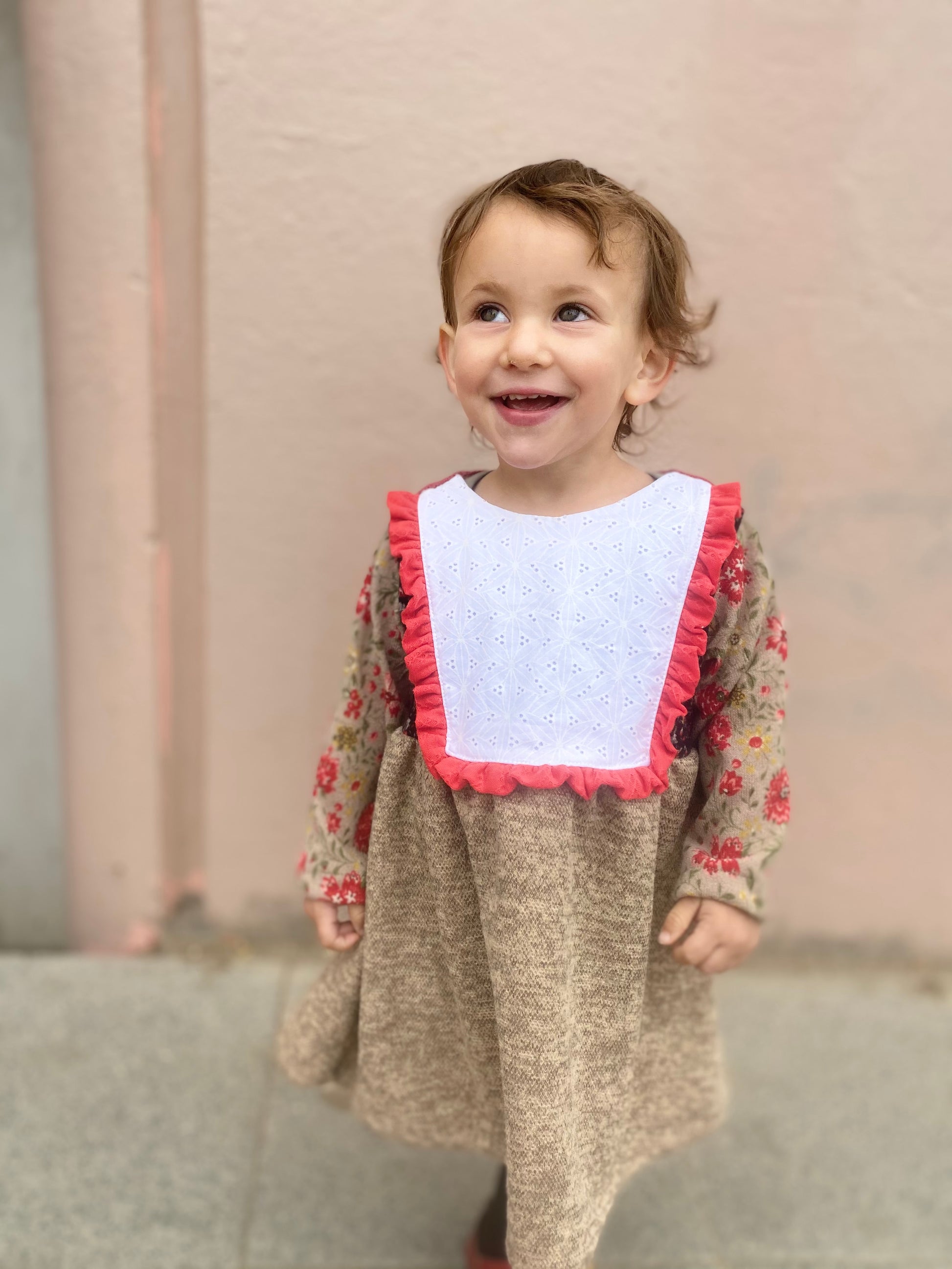 Vestido de lanilla en tonos beige, rojo y negro con canesú blanco texturado y vuelitos color sandía.