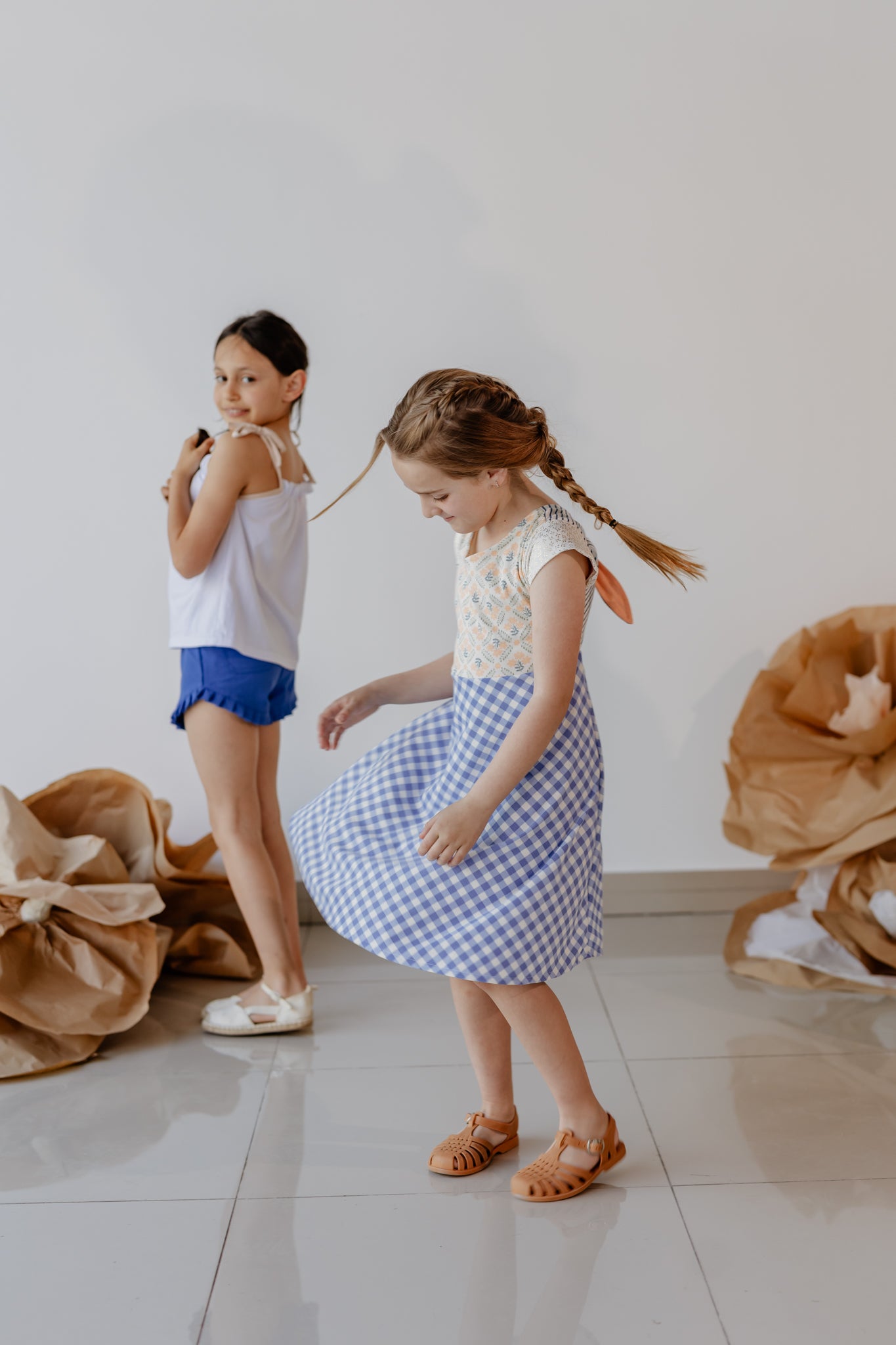 Vestido de algodón estampado en tonos blancos, azules y damasco, con lazo ajustable en la espalda.